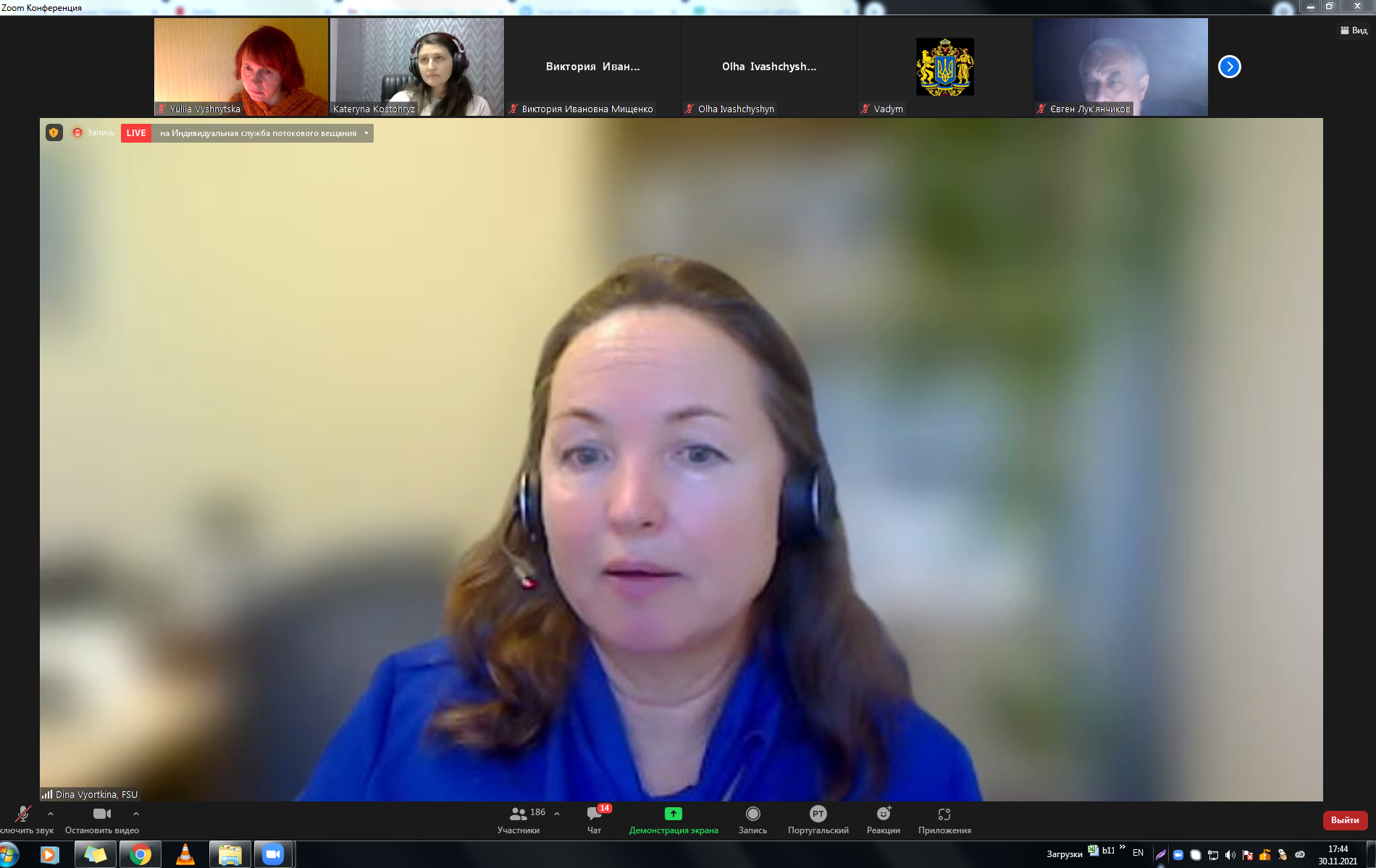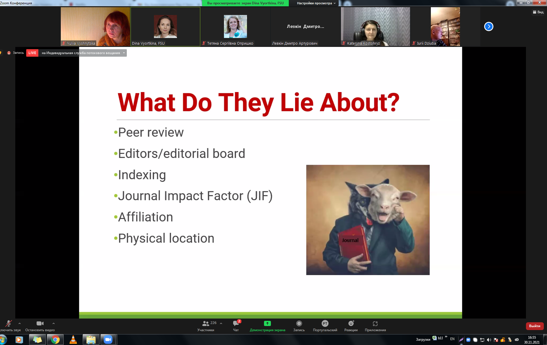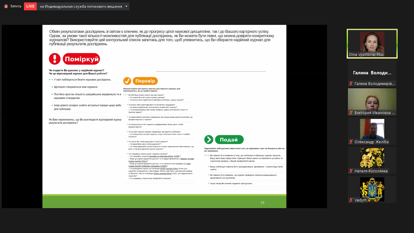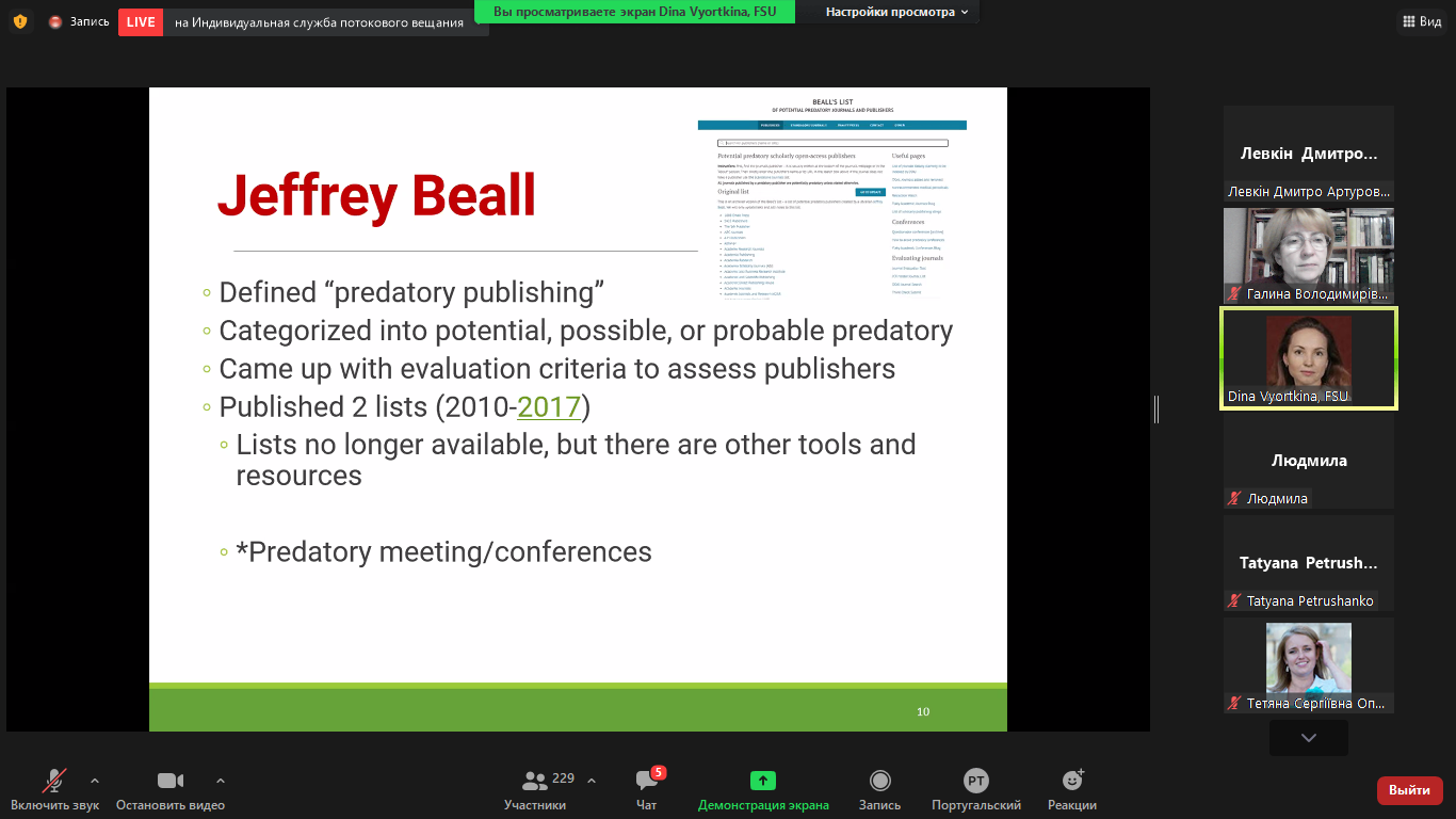 Спікер заходу Діна Вьорткіна, директор Офісу інформації та навчальних технологій Коледжу освіти Університету штату Флорида висвітлила поняття «хижацькі видання» та які наслідки має в них публікація для дослідників. Діна Вьорткіна ознайомила учасників з практиками, які можна використовувати, щоб забезпечити прозорість й ефективність перевірки наукових статей співробітників чи потенційних працівників. Серед учасників вебінару розгорнулася жвава дискусія щодо проблеми формування рейтингових списків наукових журналів для публікацій, зокрема було зауважено, що така тактика більше привертає увагу до самих журналів, а не до змісту статей.