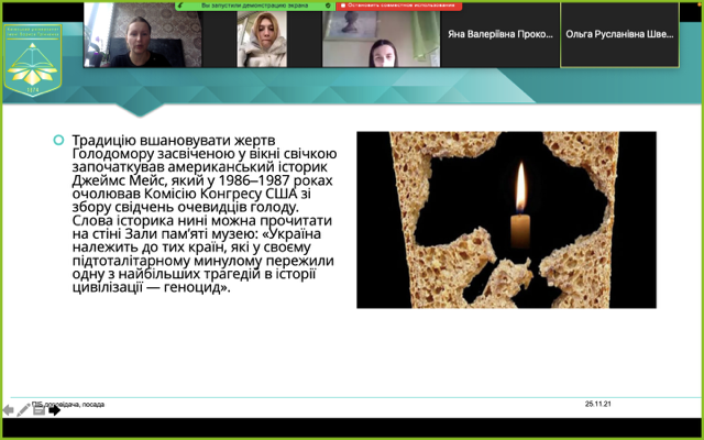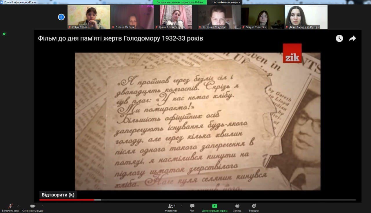 Вшановуючи пам’ять жертв Голодомору в Україні, викладачі та студенти Інституту філології Київського університету імені Бориса Грінченка провели кураторські години «І пам’яті свічка не згасне» (модератори – куратори студентських груп); переглянули художній фільм «Ціна правди» (модератор – Бойко М.І., кафедра української мови); долучилися до аналізу документального фільму «Жорна» (модератор – Лахно Н. В., кафедра української мови); здійснили віртуальну екскурсію до музею Голодомору (модератори – Блохіна Н.О., Башкирова О.М., Євтушенко С.О., кафедра української літератури, компаративістики і грінченкознавства).