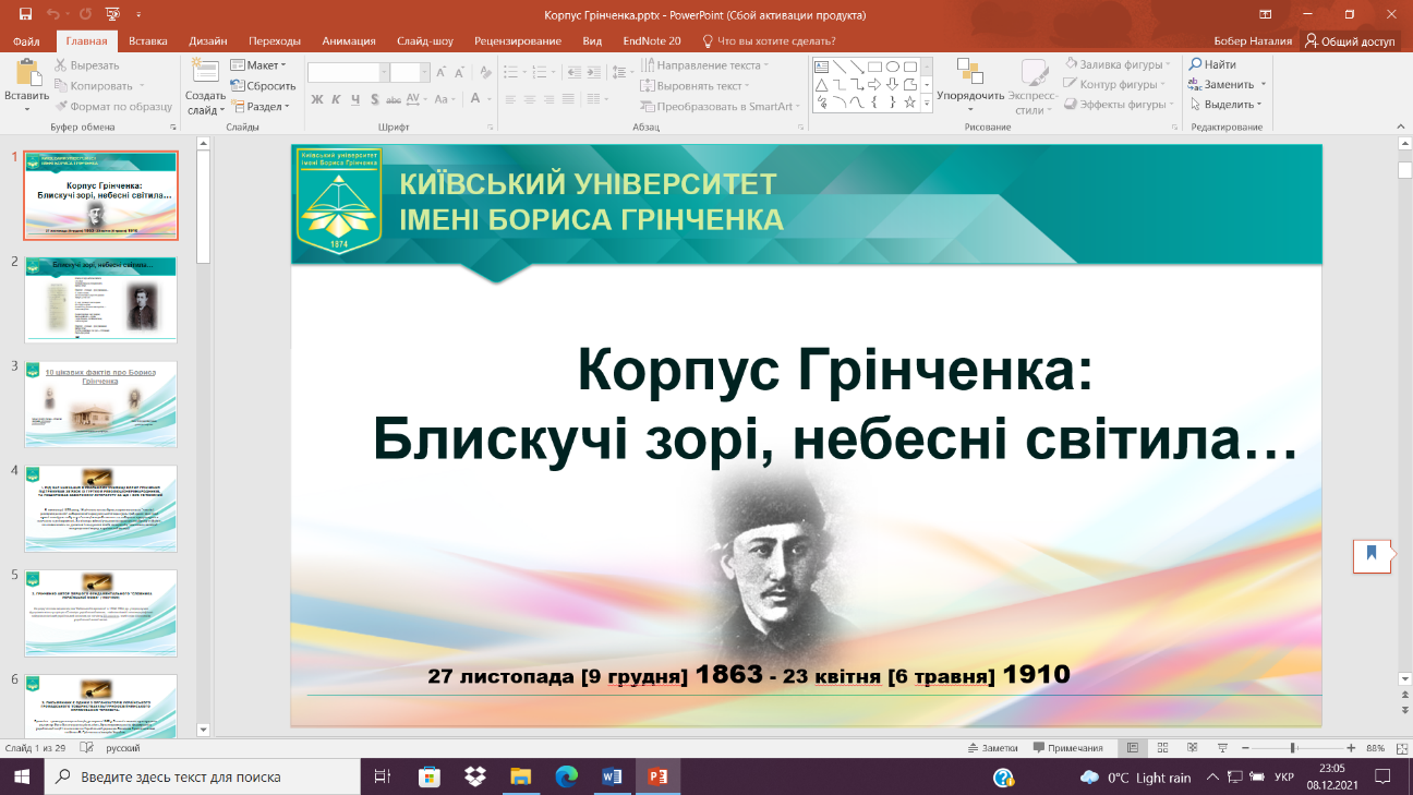 - інтерактивна лекція-бесіда «Видавнича та просвітницька діяльність родини Грінченків на тлі доби» (модератор – Яковлева І.В., молодший науковий співробітник кафедри української літератури, компаративістики і грінченкознавства);
