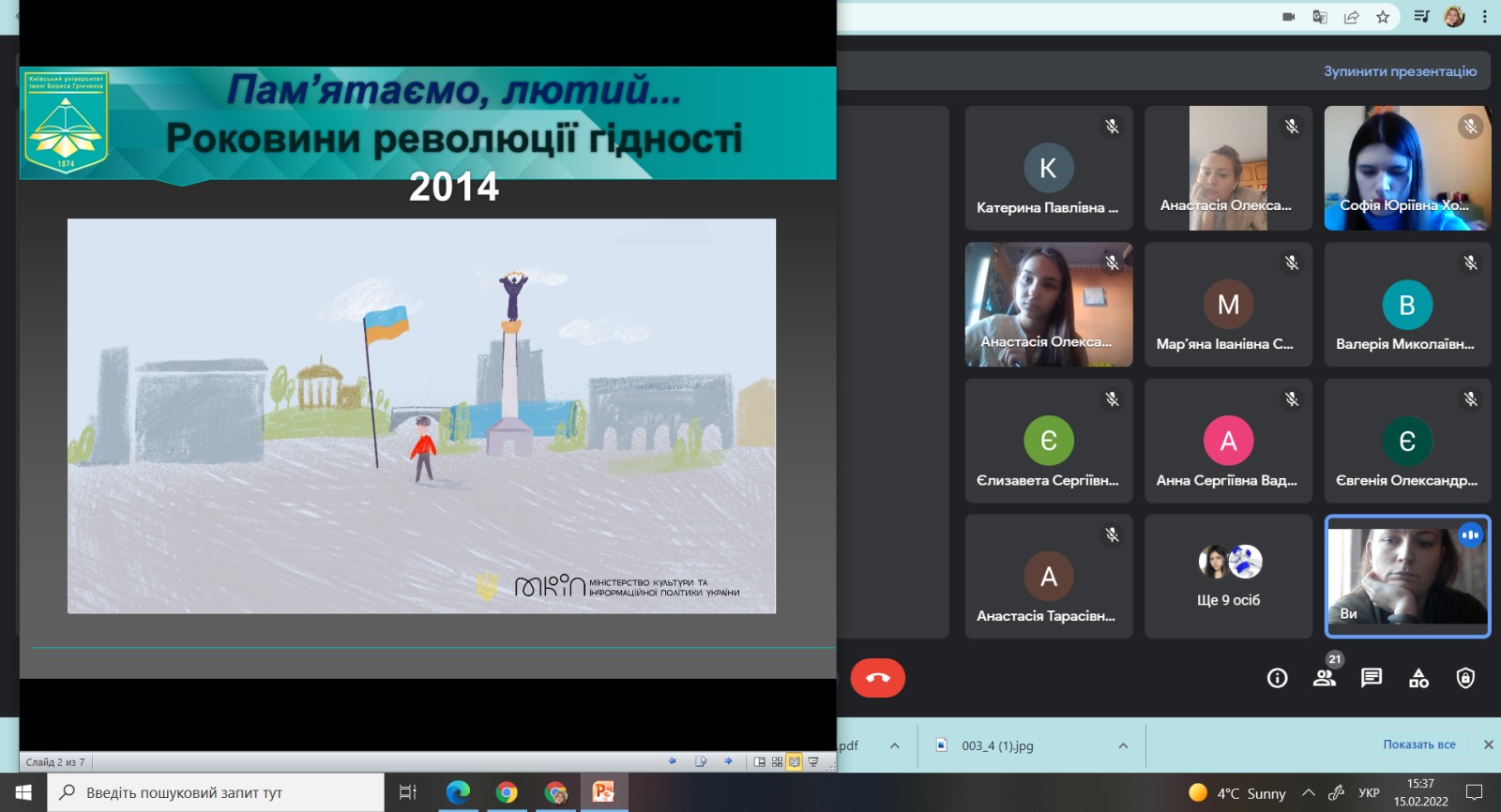 - онлайн-зустрічі з адвокаткою Євгенією Закревською «День пам’яті Героїв Небесної Сотні» (модератор – Ю.В. Вишницька, кафедра світової літератури).