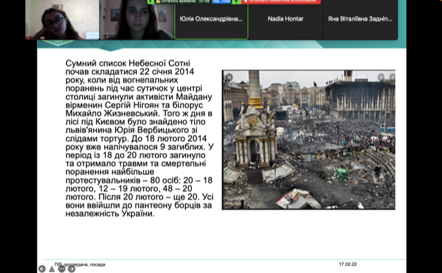 - онлайн-заняття «Революція гідності очима іноземців. Сприйняття іноземцями нашої історії. Герої Небесної Сотні. Герой України Василь Сліпак» (модератори – Т. М. Вінтонів, Т.О. Горохова, кафедра української мови);