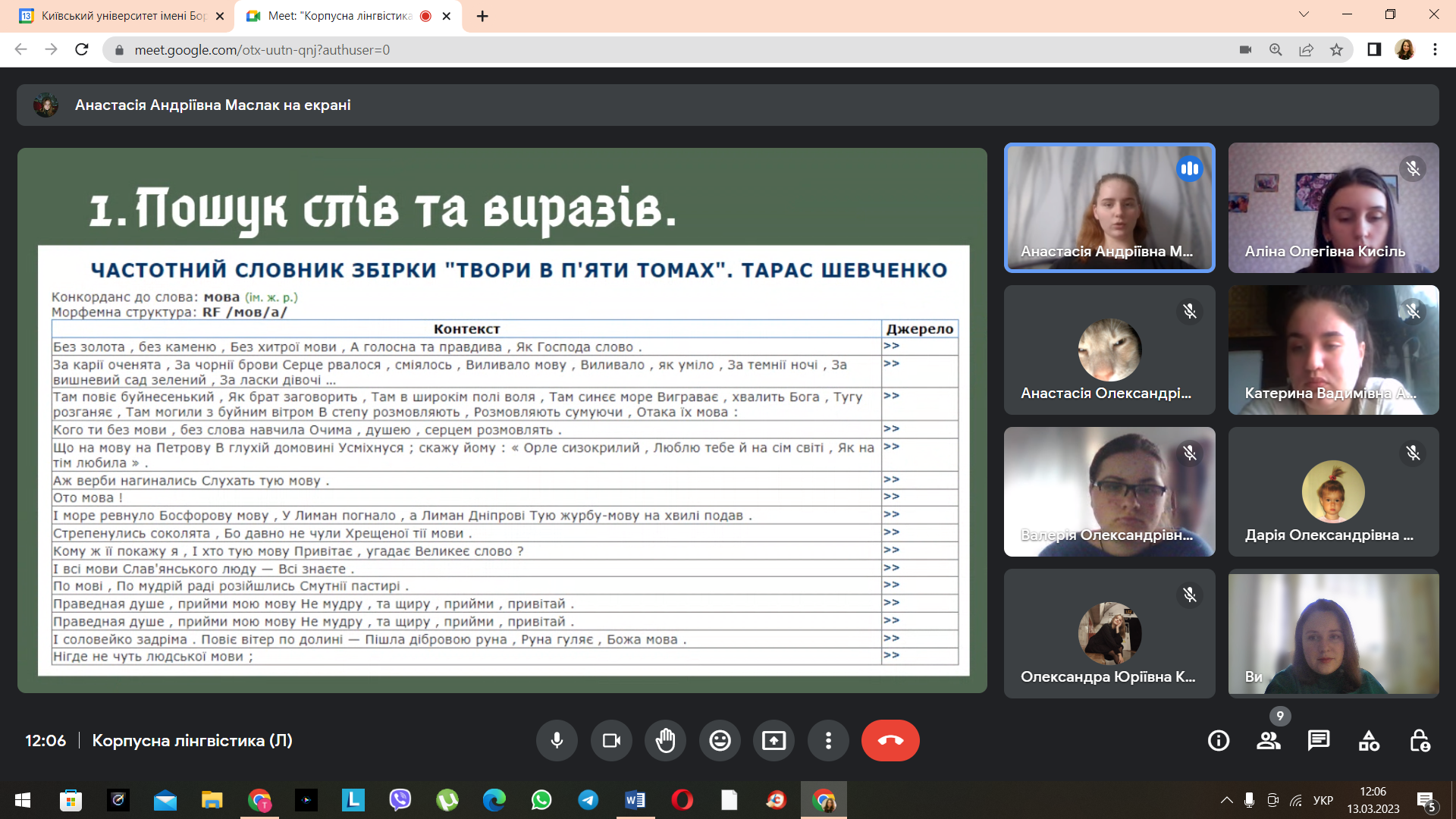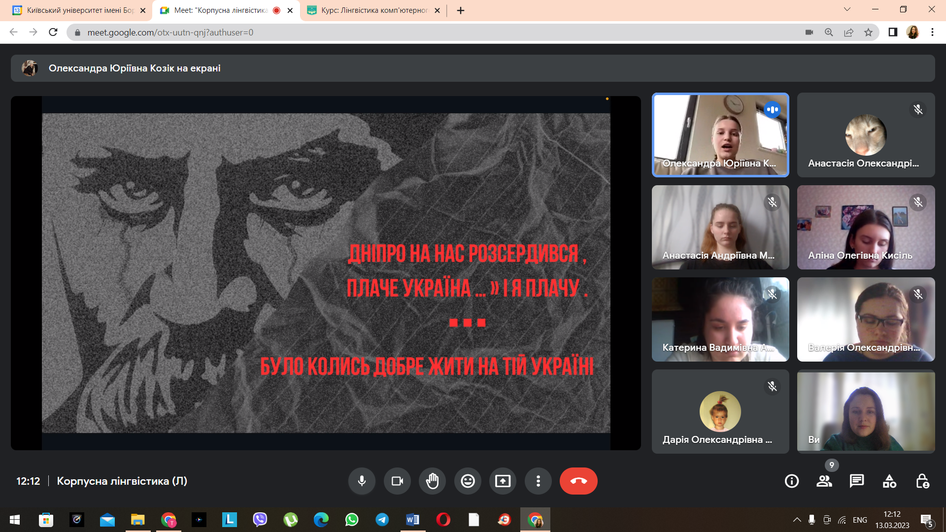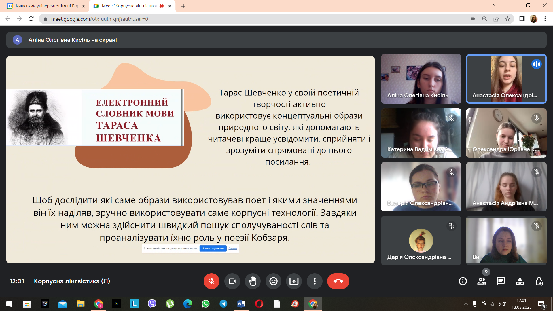 13 березня 2023 року студенти 2-го курсу Факультету української філології, культури і мистецтва Університету Грінченка вшанували пам'ять Тараса Шевченка в межах вивчення курсу «Корпусна лінгвістика» (викладач – канд. пед. наук, старший викладач Т.О. Горохова) і презентували проєкти «Корпусні технології у вивченні творчості Тараса Шевченка». Студенти проаналізували можливості корпусів текстів у реалізації лінгвістичних і літературознавчих досліджень творчого доробку Поета, а також визначили лінгводидактичний потенціал використання корпусів на уроках у закладах загальної середньої освіти.