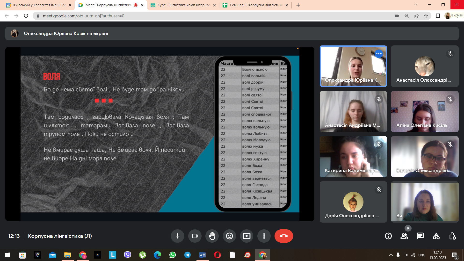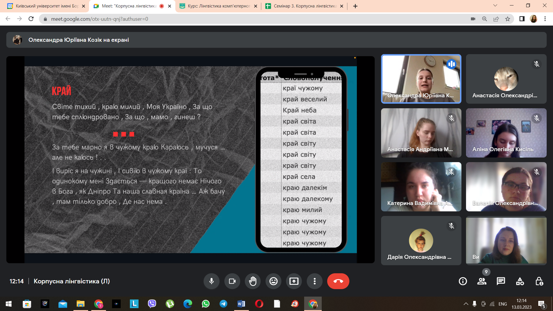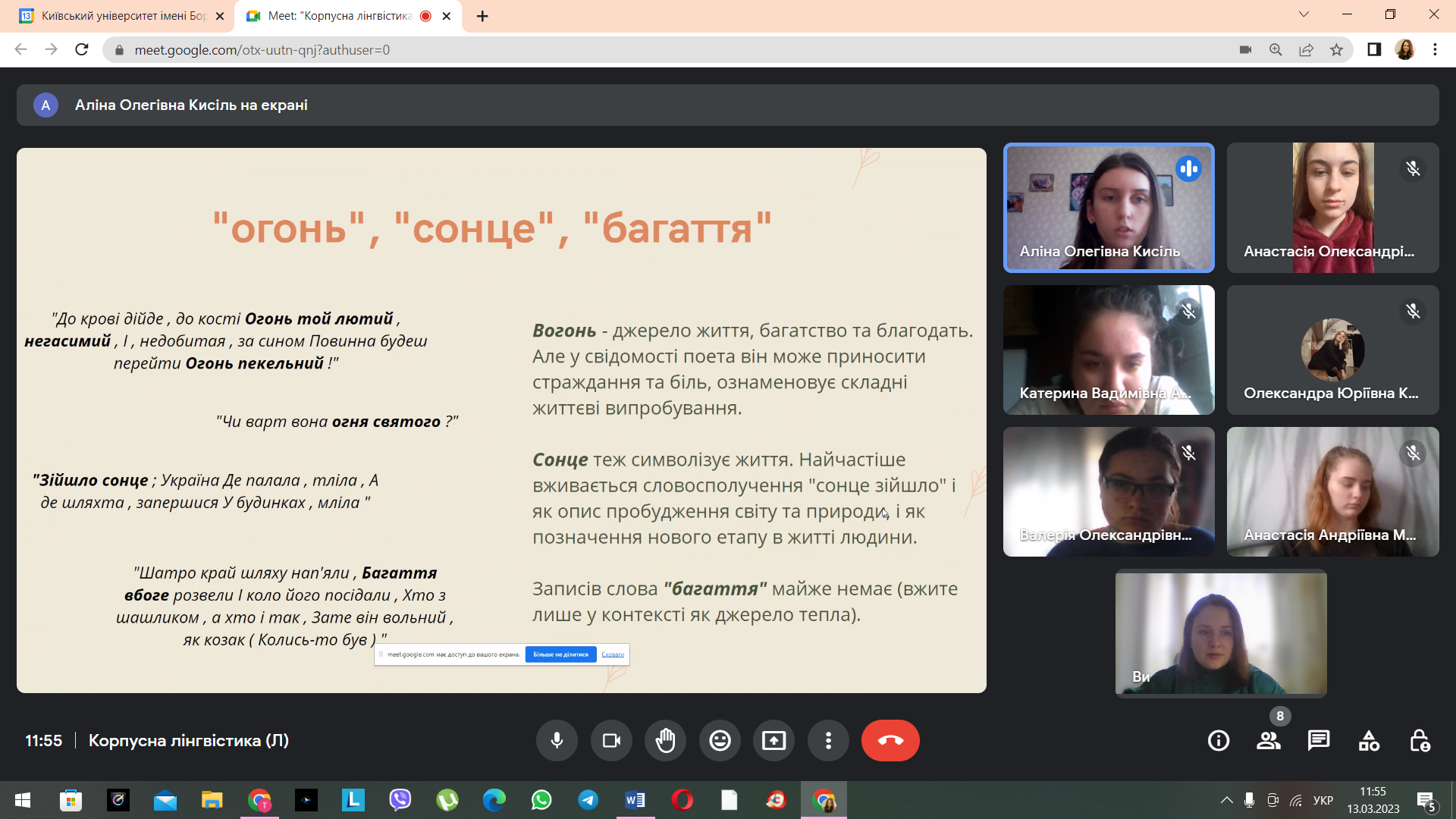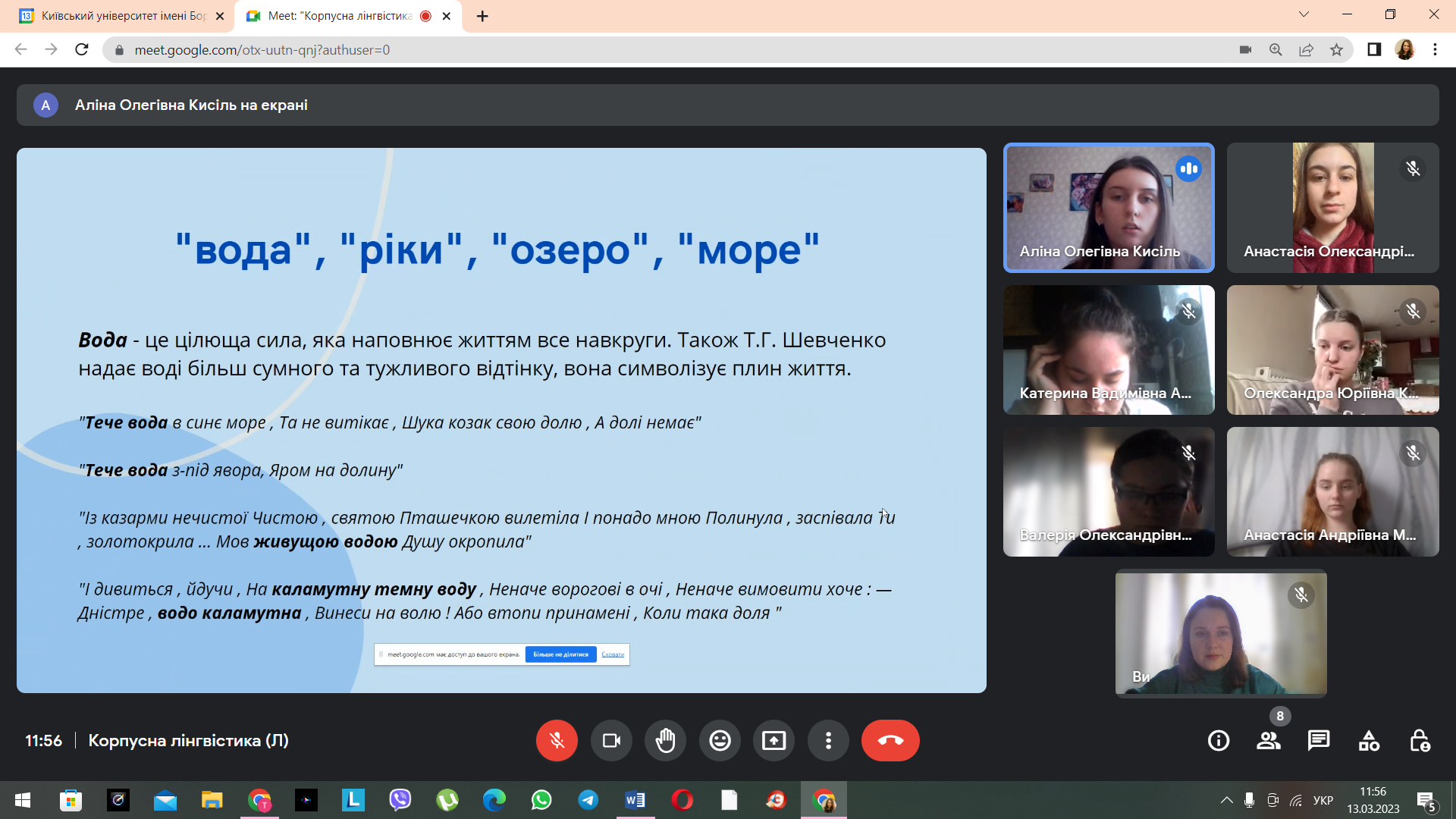 13 березня 2023 року студенти 2-го курсу Факультету української філології, культури і мистецтва Університету Грінченка вшанували пам'ять Тараса Шевченка в межах вивчення курсу «Корпусна лінгвістика» (викладач – канд. пед. наук, старший викладач Т.О. Горохова) і презентували проєкти «Корпусні технології у вивченні творчості Тараса Шевченка». Студенти проаналізували можливості корпусів текстів у реалізації лінгвістичних і літературознавчих досліджень творчого доробку Поета, а також визначили лінгводидактичний потенціал використання корпусів на уроках у закладах загальної середньої освіти.