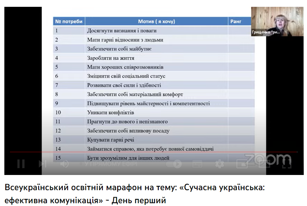 Сьогодні науковцями засвідчено, що соціум потребує людей, здатних досягати результату, тобто сильних особистостей, мотивованих на успіх. У межах тренінгу «Роль лідерства у популяризації української мови» (спікер - Грищенко І.М.) учасники не лише ознайомилися з основними принципами лідерства, а й пройшли тест «Діагностики задоволеності основних потреб», розробили карту для досягнення успіхів у професійній сфері.