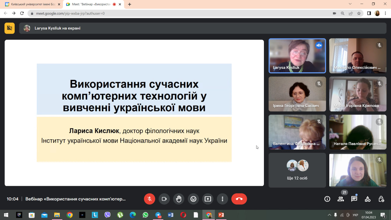 вебінар «Використання сучасних комп’ютерних технологій у вивченні української мови» (Л. Кислюк, доктор філологічних наук, старший науковий співробітник відділу лексикології, лексикографії та структурно-математичної лінгвістики Інституту української мови НАН України, М. Вінтонів, доктор філологічних наук, професор, завідувач кафедри української мови);