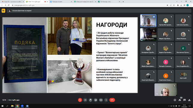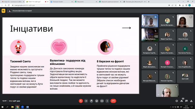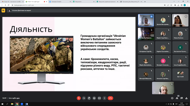 вебінар «Волонтерство, комунікації під час війни» (А. Данілова, голова ГО «Український Жіночий Батальйон», Т. Саврасова-В’юн, кандидат психологічних наук, доцент кафедри української літератури, компаративістики і грінченкознавства);