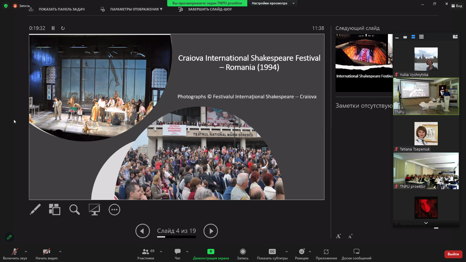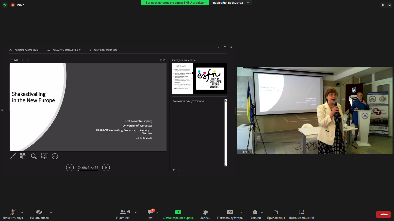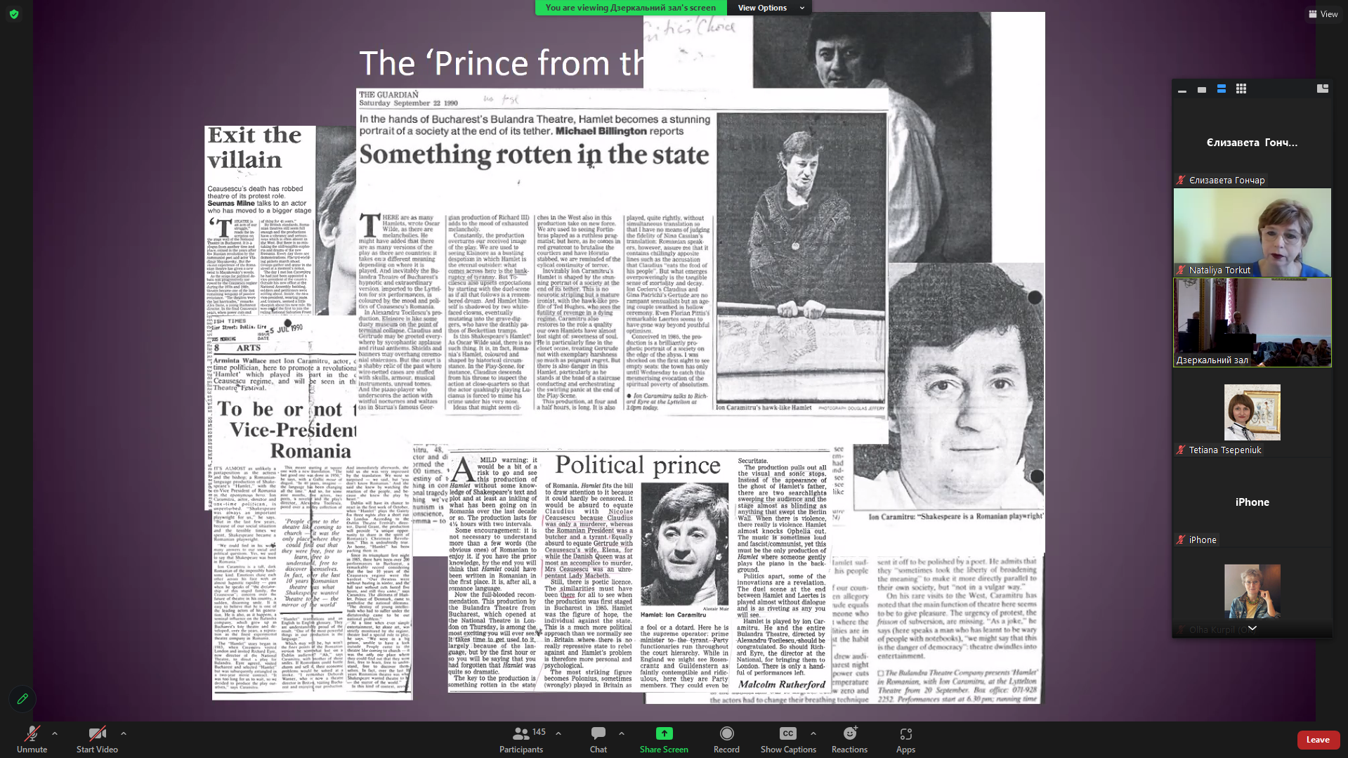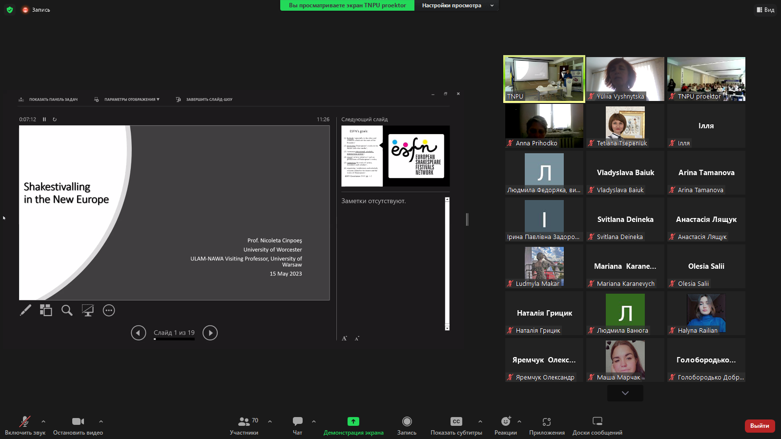 Студенти-грінченківці разом із модератором, Юлією Василівною Вишницькою, доктором філологічних наук, доцентом кафедри світової літератури, прослухали лекції професора Ніколети Чінпоеш (Вустерський Університет, Велика Британія) і взяли участь в обговоренні: «Who’s there»: Hamlet in post – 1989 Romania (11.05.2023); «Shakestivaling in Europe» (15.05.2023); «Female Agency in «The Merchant of Venice»» (16.05.2023).