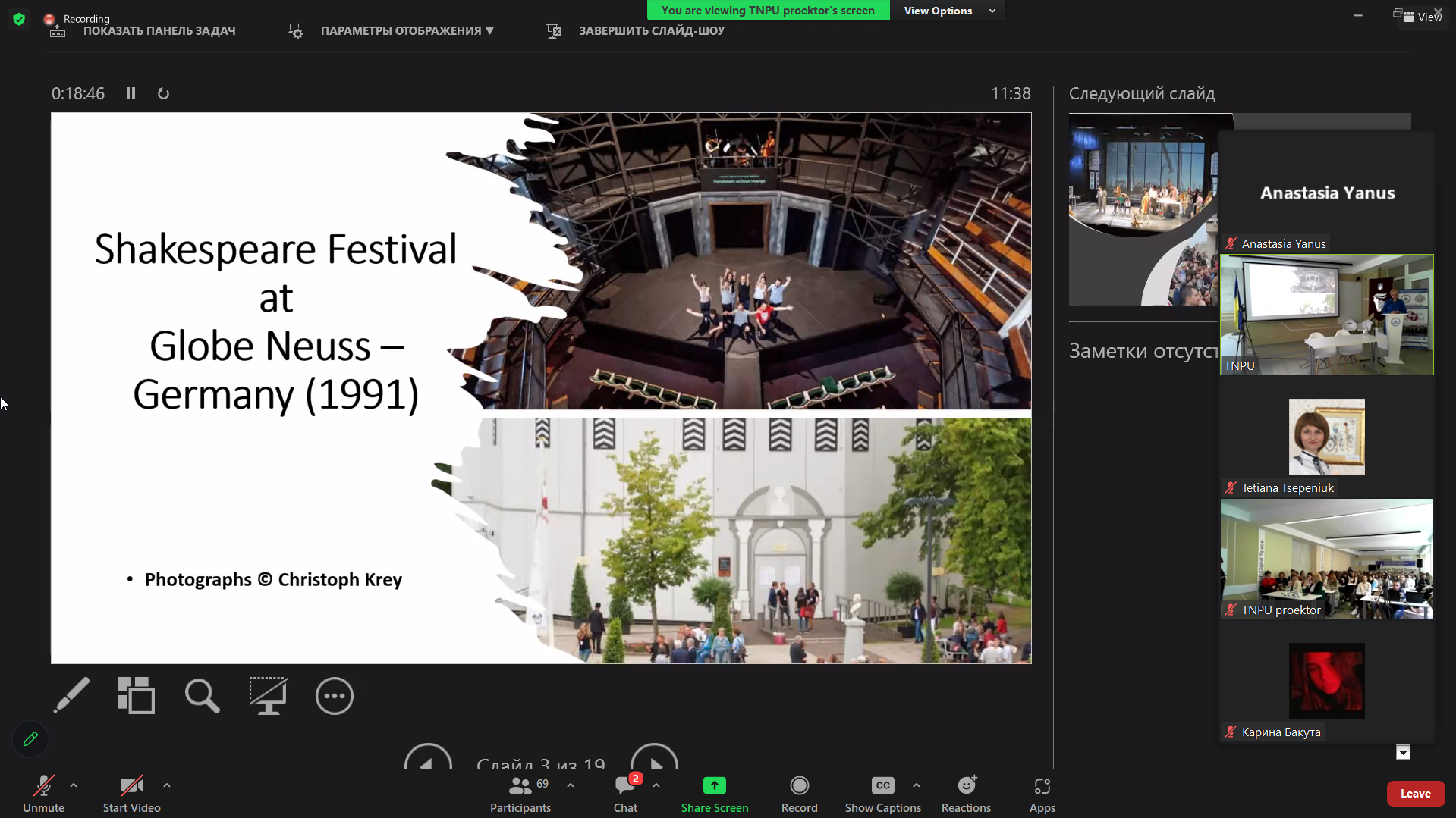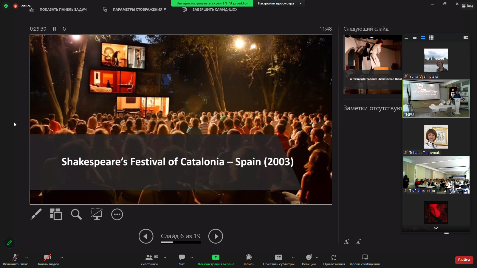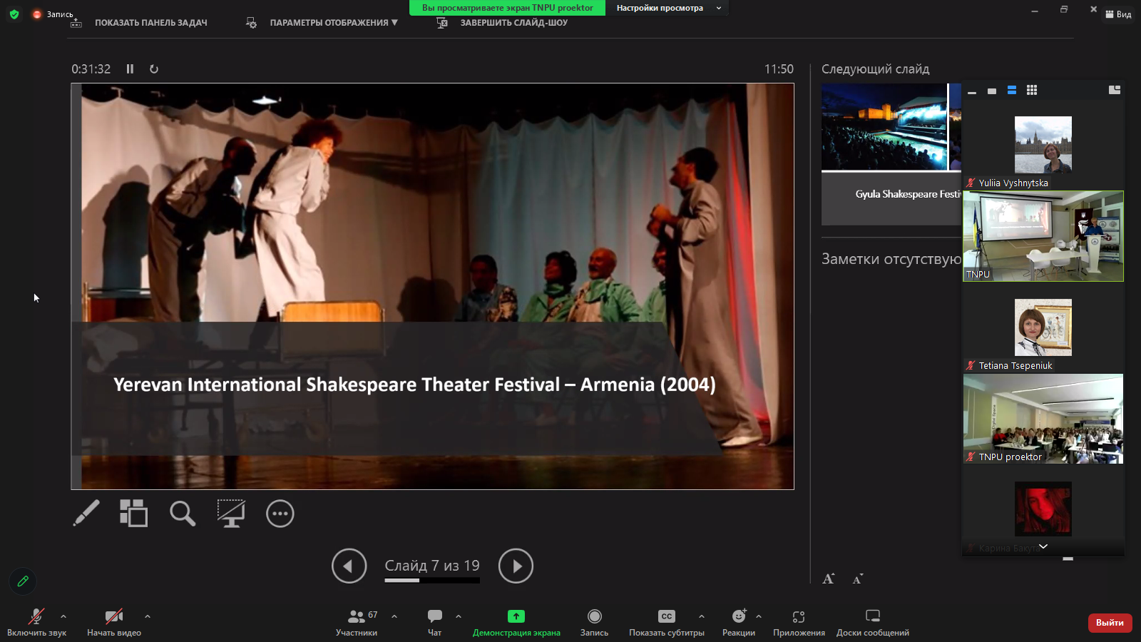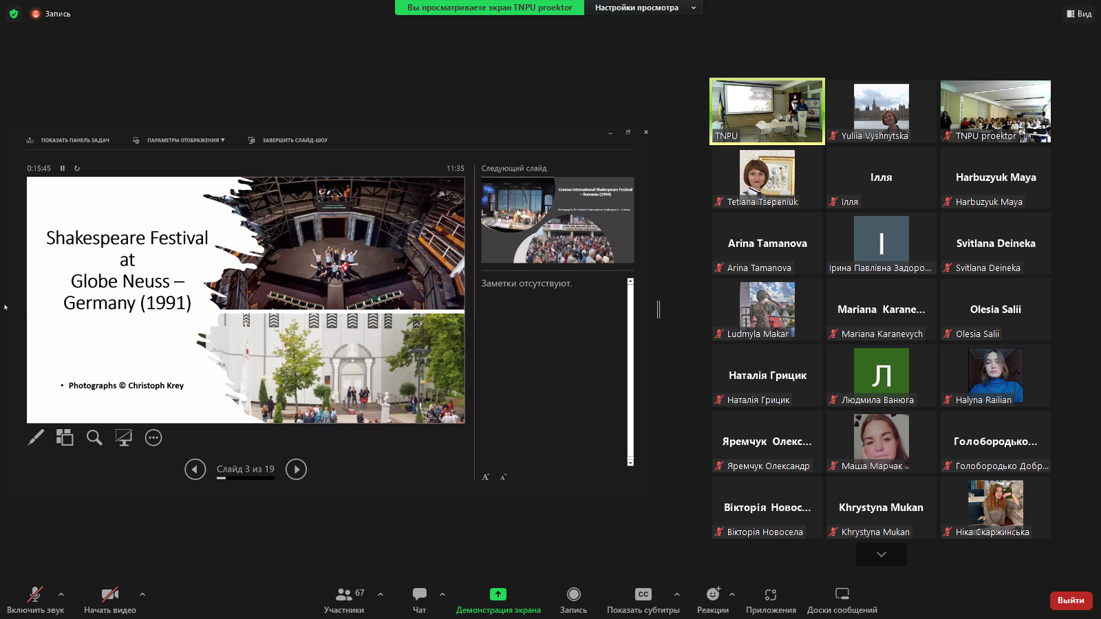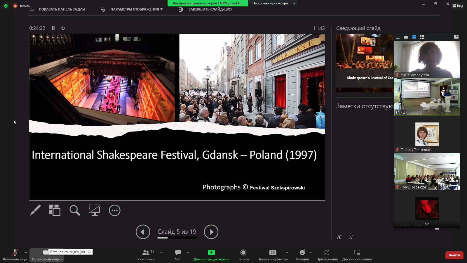 Студенти-грінченківці разом із модератором, Юлією Василівною Вишницькою, доктором філологічних наук, доцентом кафедри світової літератури, прослухали лекції професора Ніколети Чінпоеш (Вустерський Університет, Велика Британія) і взяли участь в обговоренні: «Who’s there»: Hamlet in post – 1989 Romania (11.05.2023); «Shakestivaling in Europe» (15.05.2023); «Female Agency in «The Merchant of Venice»» (16.05.2023).