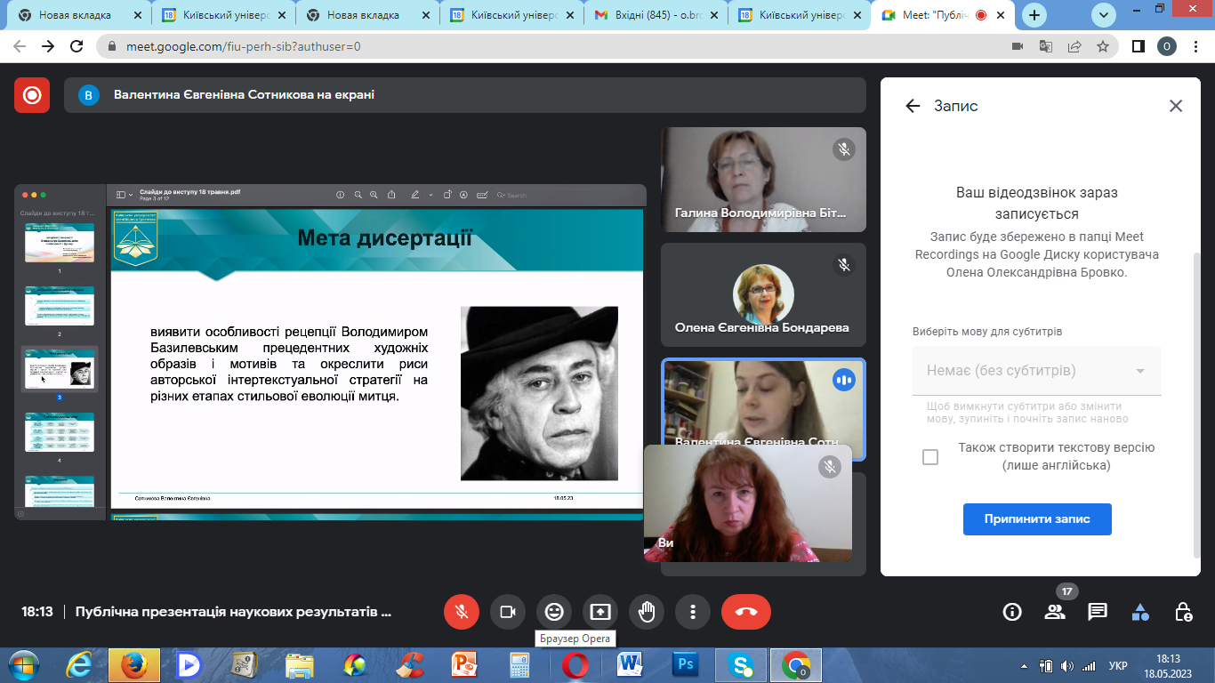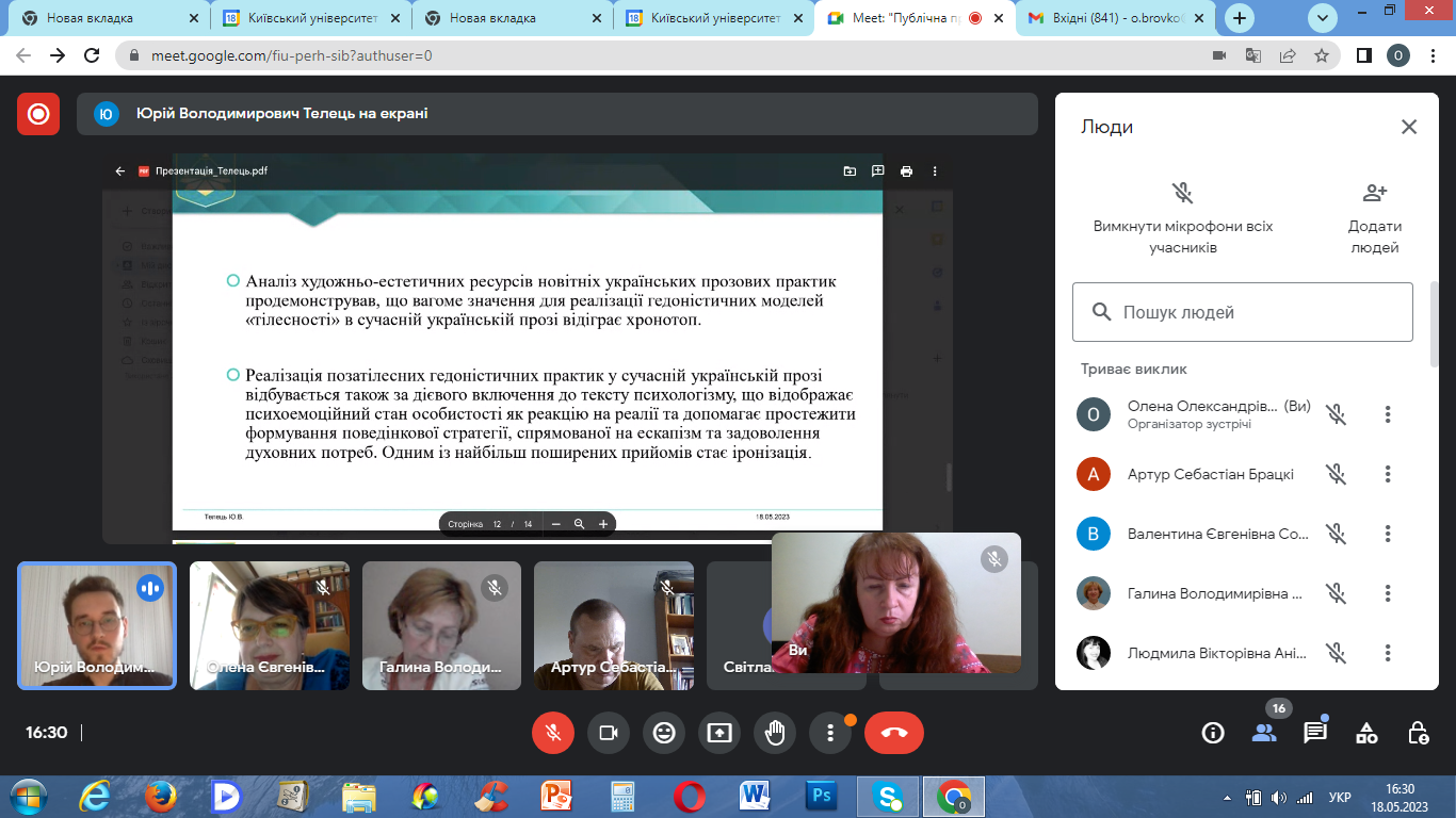 Науковці кафедри української літератури, компаративістики і грінченкознавства та кафедри світової літератури активно долучилися до обговорення презентацій результатів досліджень Юрія Тельця «Гедонізм як посттоталітарна літературна стратегія (на матеріалі сучасної української прози)» (науковий керівник – Бондарева Олена Євгенівна, доктор філологічних наук, професор) і Валентини Сотникової «Інтертекст творчості Володимира Базилевського: особливості і функції» (науковий керівник – Гальчук Оксана Василівна, доктор філологічних наук, професор). Цікава дискусія розгорнулася навколо дослідження аспірантки ІV року навчання Анастасії Трофименко «Модифікація жанру горог в українській літературі» (науковий керівник – Башкирова Ольга Миколаївна, доктор філологічних наук).