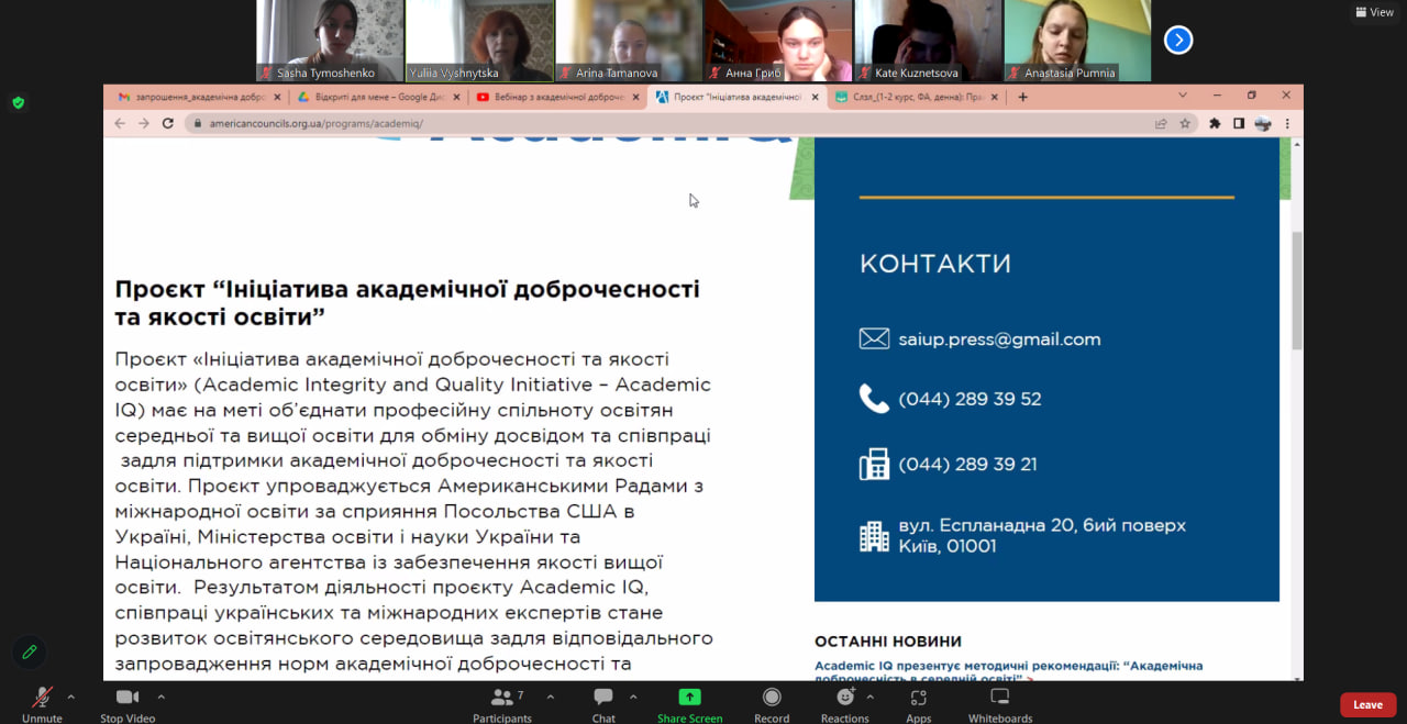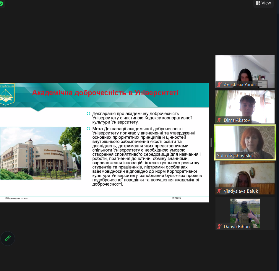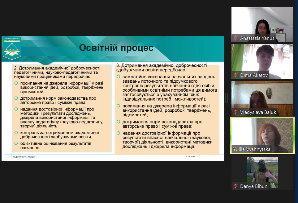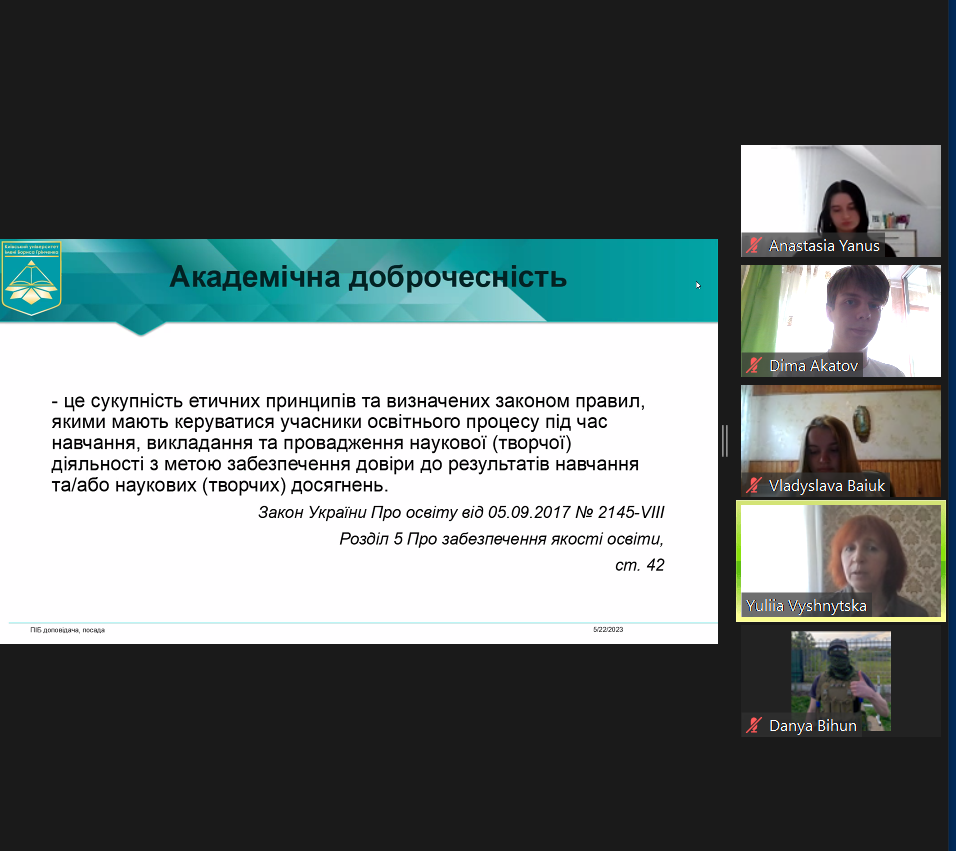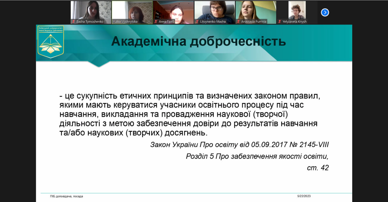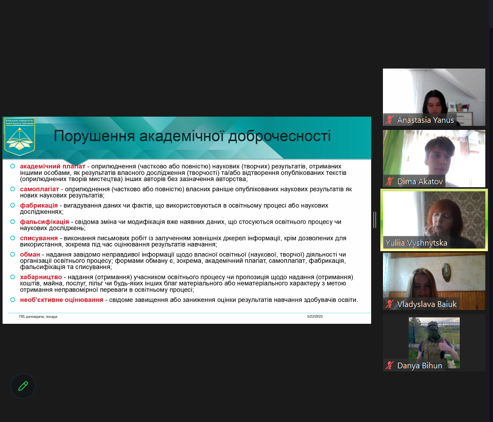 Діяльність лабораторії розпочалася активною співпрацею зі здобувачами. У цей день проведено низку семінарів з академічної доброчесності для бакалаврів факультету. Так, студенти груп ФАб-1-21-4.0д, ФАб-2-21-4.0д, ФАб-3-21-4.0д ознайомилися з офіційними документами щодо академічної доброчесності, проєктом Американських Рад із міжнародної освіти «Ініціатива академічної доброчесності та якості освіти»; переглянули відеозапис вебінару з академічної доброчесності, який кафедра провела за кілька днів до повномасштабного вторгнення росії в Україну; висловили власні міркування щодо запобігання різним формам плагіату.