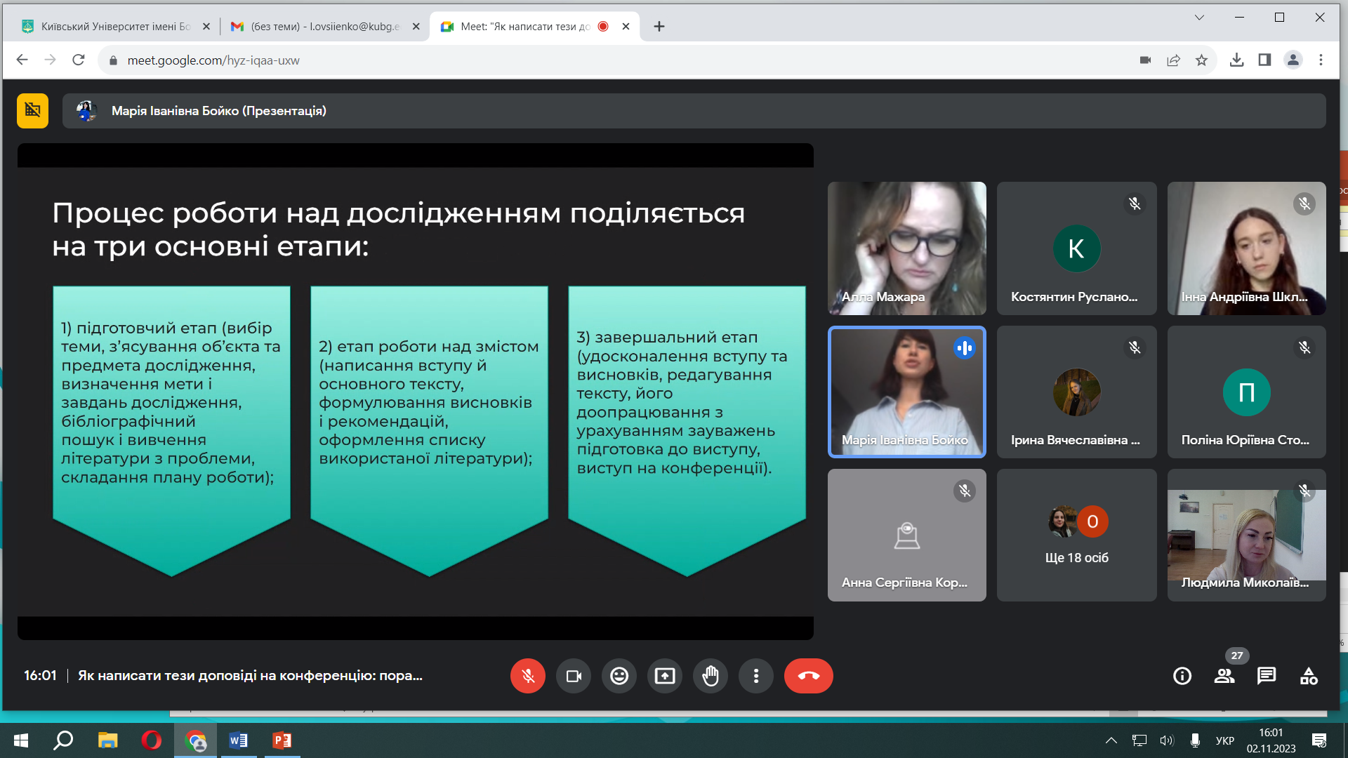 Правильну траєкторію руху на шляху до хороших професійних тез, а згодом і публікації у фаховому виданні, презентувала Марія Іванівна Бойко, кандидат педагогічних наук, старший викладач кафедри української мови, заступник голови наукового товариства Факультету.