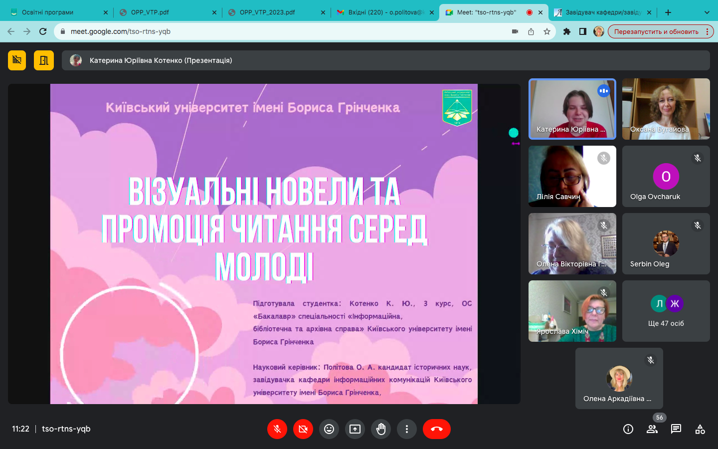 Важливо, що свої наукові здобутки представили і здобувачі освіти. Зокрема, Котенко К.Ю., студентка 3 курсу спеціальності «Інформаційна, бібліотечна та архівна справа» виступила з темою «Візуальні новели та промоція читання з-поміж молоді».
