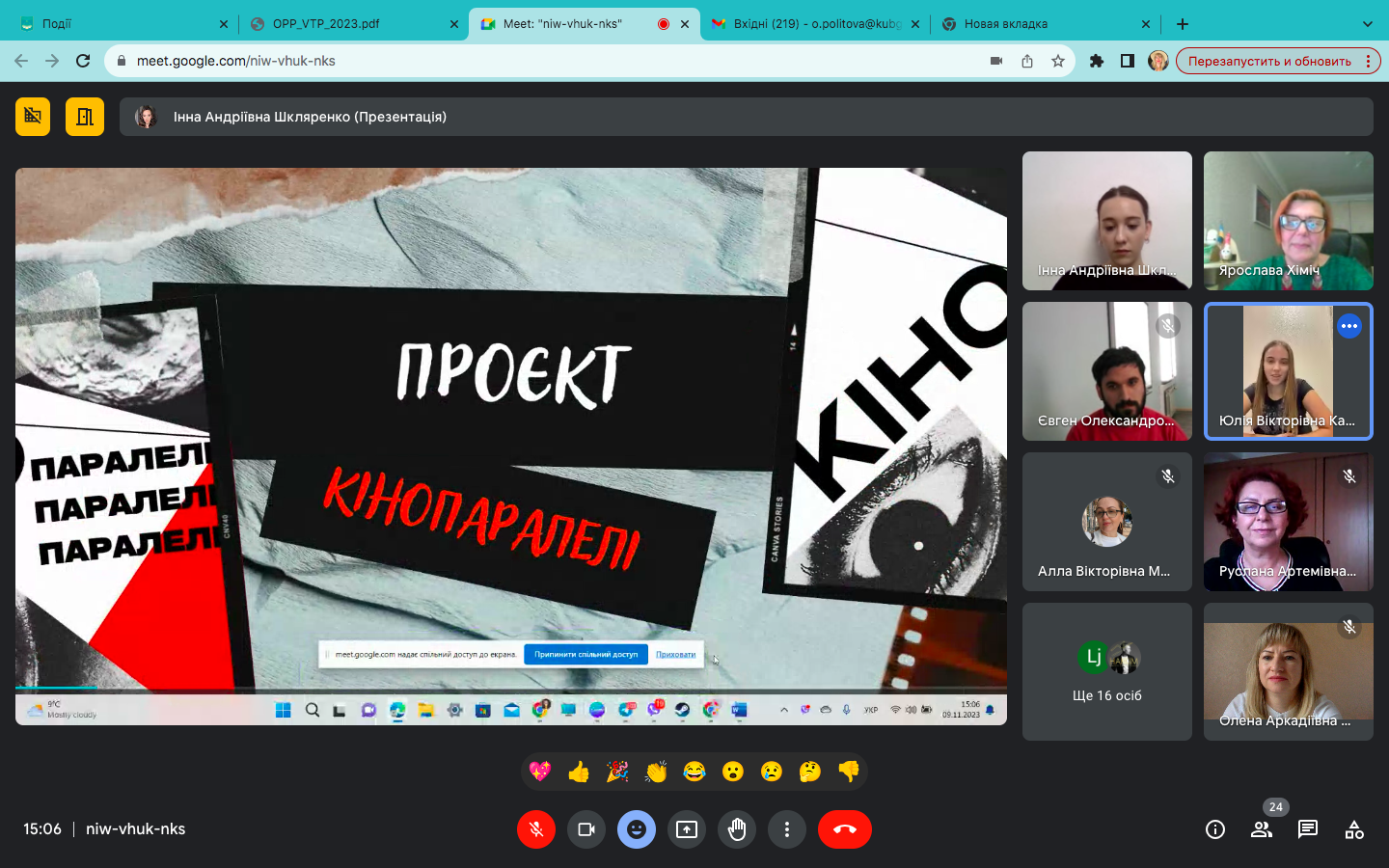 09 листопада 2023 року, у межах заходів до Всесвітнього дня науки, викладачі кафедри інформаційних комунікацій та здобувачі освіти долучилися до ІV Всеукраїнської науково-практичної конференції «Культурні та мистецькі студії ХХІ століття: науково-практичне партнерство» (організатор – партнер Університету Грінченка – Національна академії керівних кадрів культури і мистецтв). Конференція відбулася онлайново у форматі пленарного та секційних засідань і круглого столу.