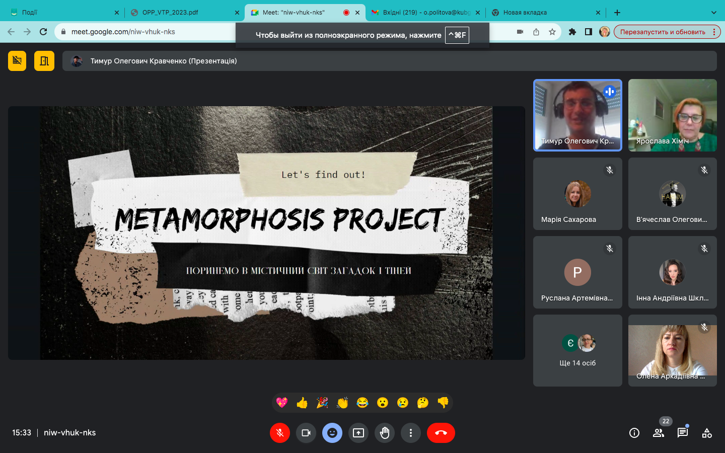Неабияке зацікавлення учасників викликали проєкти грінченківців, зокрема проєкт, присвячений дослідженню українського театру як маркеру національної ідентичності (співдоповідь Новікової Р.А., доцента кафедри інформаційних комунікацій, заслуженої артистки України та Терещенко Н.М, доцента кафедри інформаційних комунікацій, кандидата педагогічних наук, доцента).