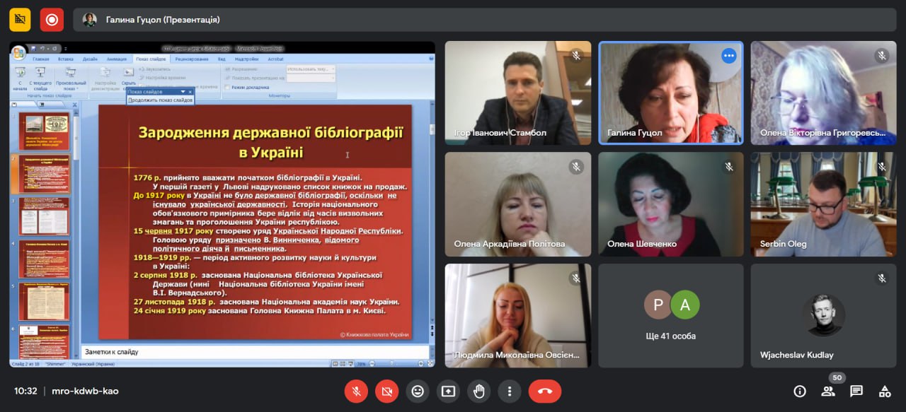 Галина Гуцол, фахівець бібліотечної галузі, заступник директора з наукової роботи Державної наукової установи «Книжкова палата України імені Івана Федорова», розповіла учасникам конференції про діяльність Книжкової палати України як центру державної бібліографії.