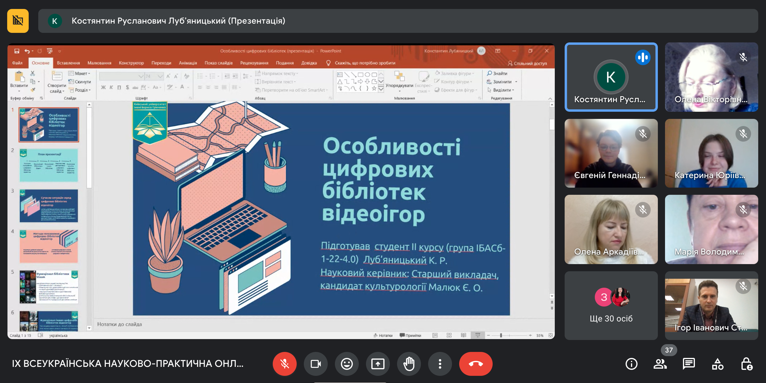На пленарному засіданні мали слово й здобувачі освіти: Андрій Своровський, магістрант КУБГ та співробітник бібліотеки імені Лесі Українки, розповів про особливості підготовки електронного бібліографічного покажчика «Петро Болбочан – залізний полковник Армії УНР (до 140-річчя з дня народження)» (Київ, 2023); Анастасія Салтикова, магістрантка КУБГ, доповіла про дизайн-проєкт вебсайту бібліотеки як напрям удосконалення невербальної комунікації з користувачем.