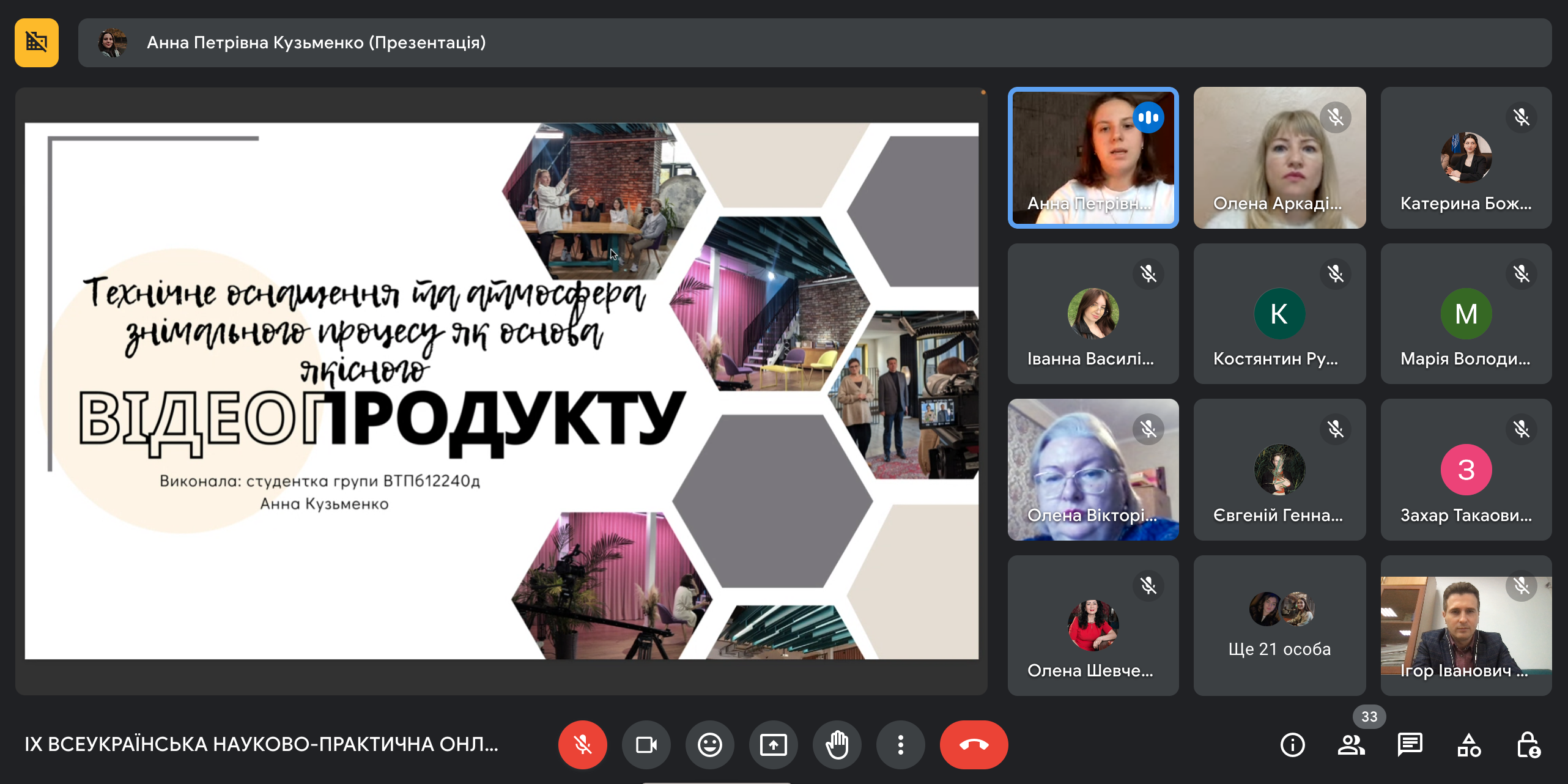 Студенти спеціальності «Аудіовізуальне мистецтво і виробництво» теж долучилися до обговорення важливих питань теми конференції. Так, Анна Кузьменко, Тимур Кравченко, Анастасія Євтушенко, Юлія Карпук, Анастасія Хісматуліна, Карина Середюк, Інна Шкляренко, Аліна Коваленко виголосили доповіді, що стосувалися боротьби українського театру за рідну мову; заміни російського контенту українським; технічного оснащення та атмосфери знімального процесу; проєкту «metamorphosis projekt»; підготовки до зйомки аудіовізуального продукту як процесу пізнання.