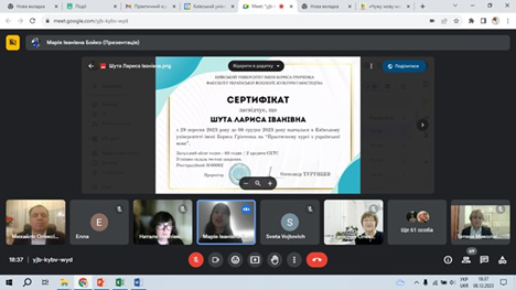 Кафедра української мови Київського університету імені Бориса Грінченка продовжує працювати над покращенням якості мовного середовища м. Києва. У рамках проєкту «Динаміка мовного середовища міста Києва» 8 грудня 2023 року завершено безоплатні курси для працівників сфери транспорту м. Києва з підвищення рівня володіння державною мовою, які тривали з 29 вересня 2023 р. На «Практичний курс української мови» зареєструвалося 144 слухачі, з якими кафедра працювала за спеціально розробленою для них робочою програмою. Слухачі відвідували щоп`ятниці заняття, активно виконували практичні завдання, тести як на занятті, так і в системі «Мудл», залюбки спілкувалися, поглиблювали свої навички комунікації державною мовою.