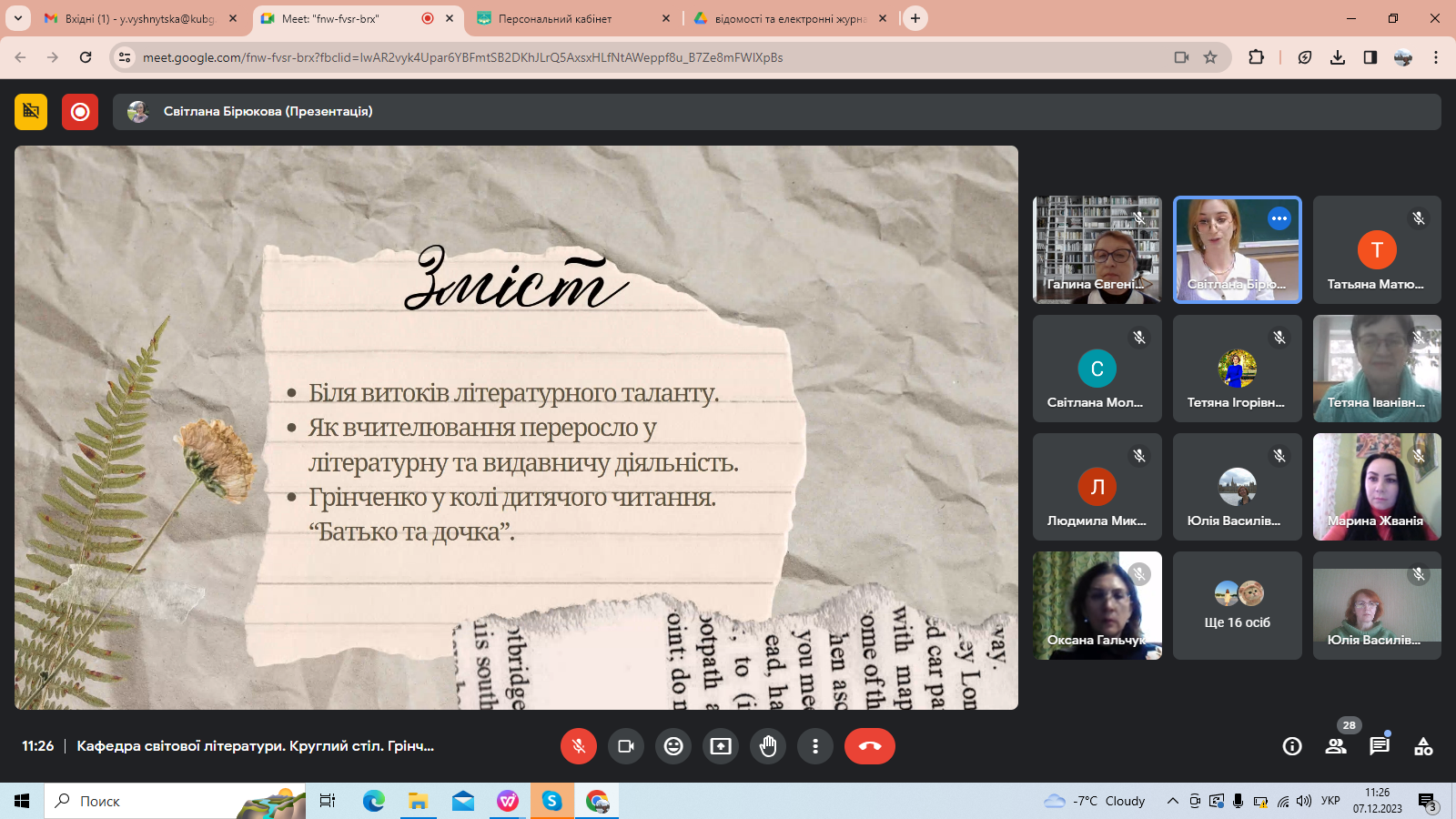 Наймолодша учасниця круглого столу, студентка ІІ курсу Обласного коледжу «Кременчуцька гуманітарно-технічна академія імені А.С. Макаренка» Поліна Цимбалій, виголосила доповідь на тему «Дитина і дитинство у творчості Бориса Грінченка» (науковий керівник – викладач коледжу, кандидат філологічних наук Ірина Кірічек).