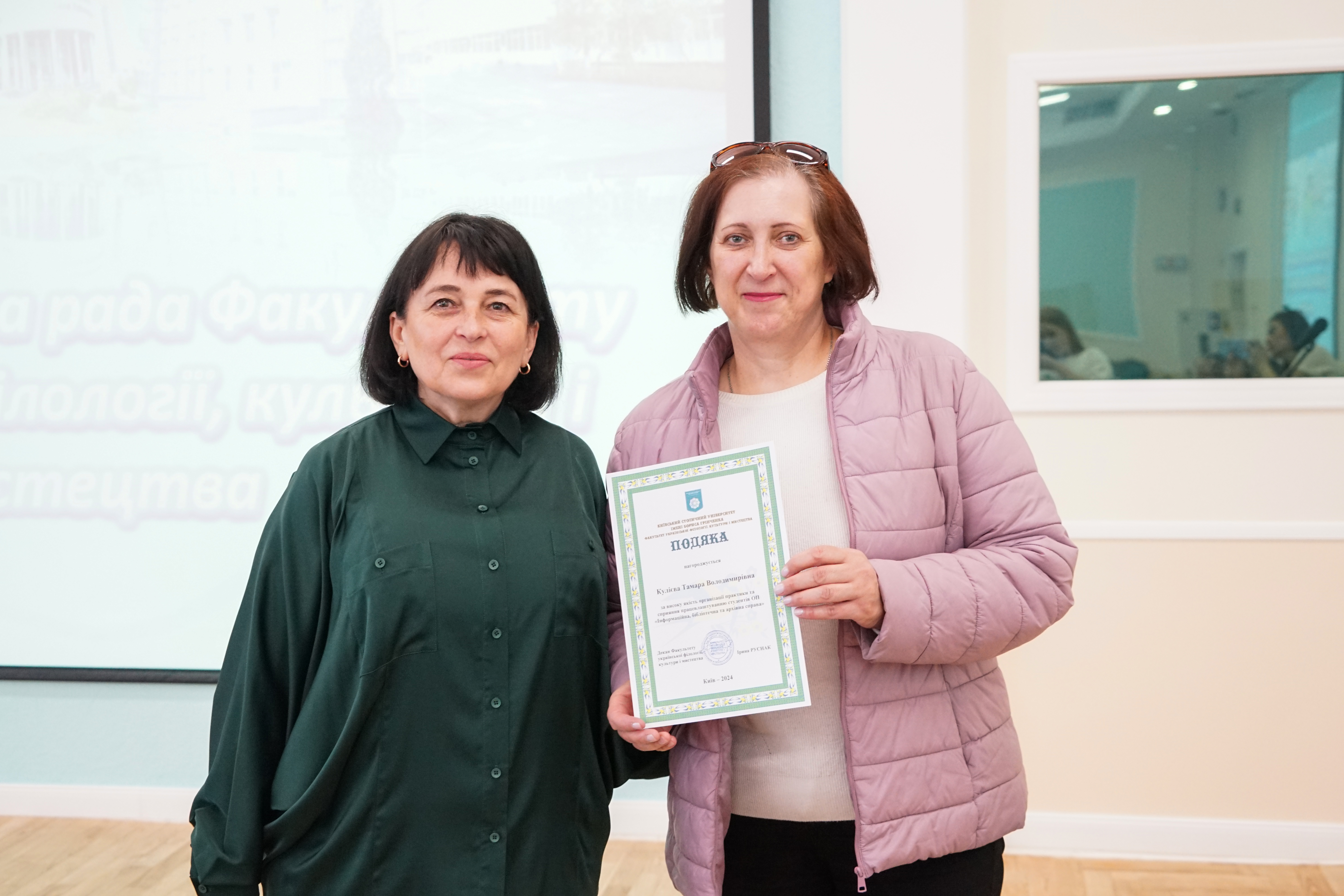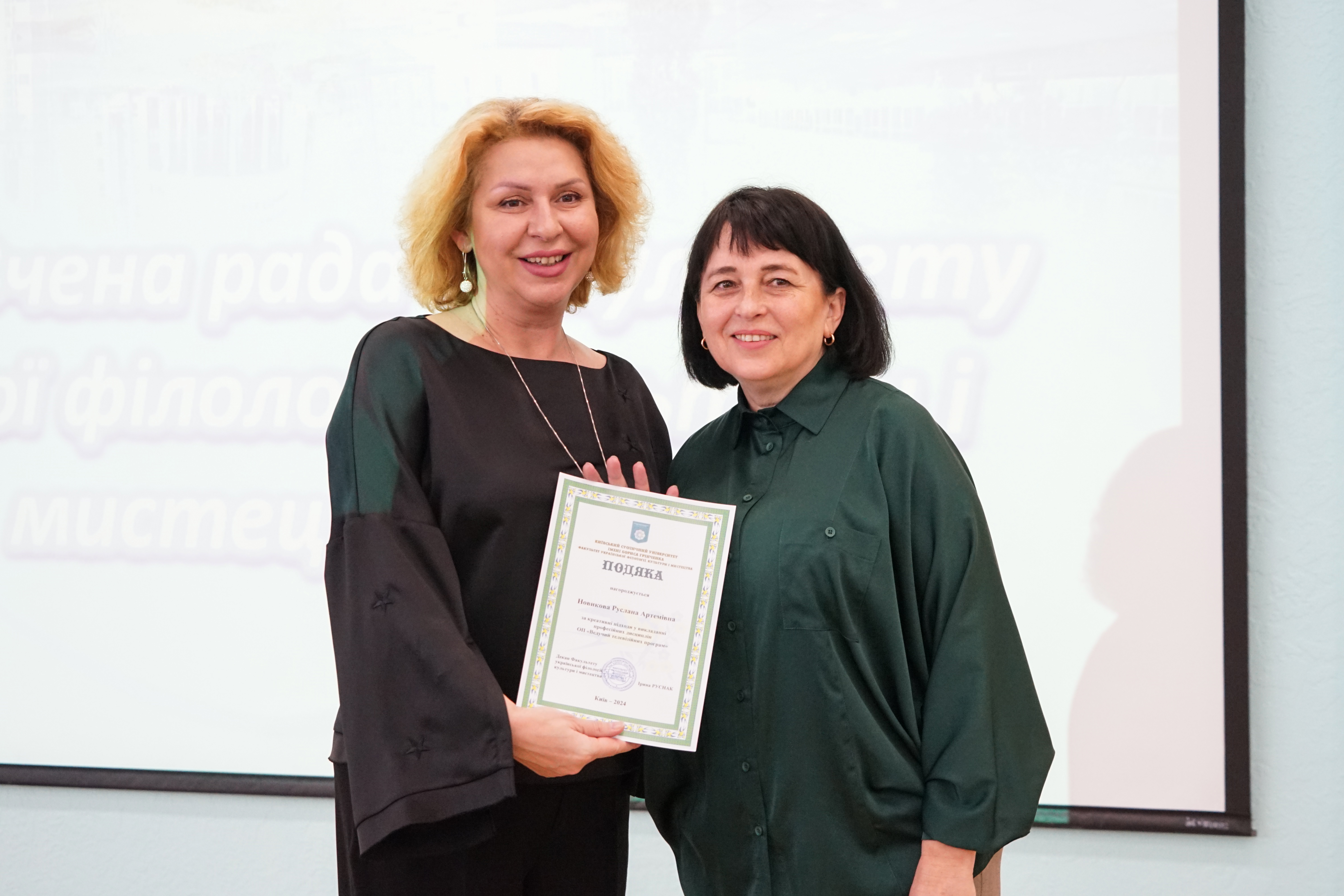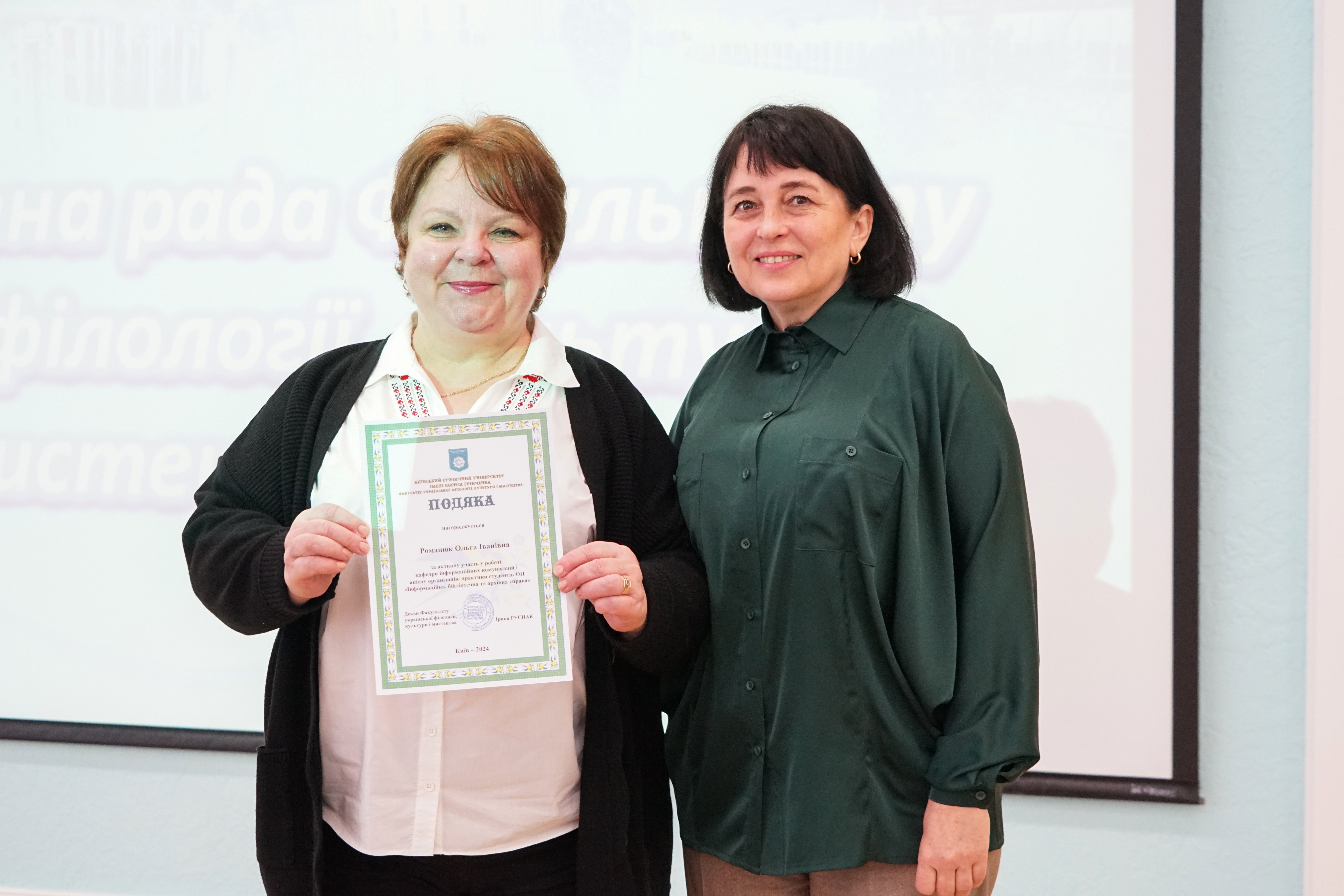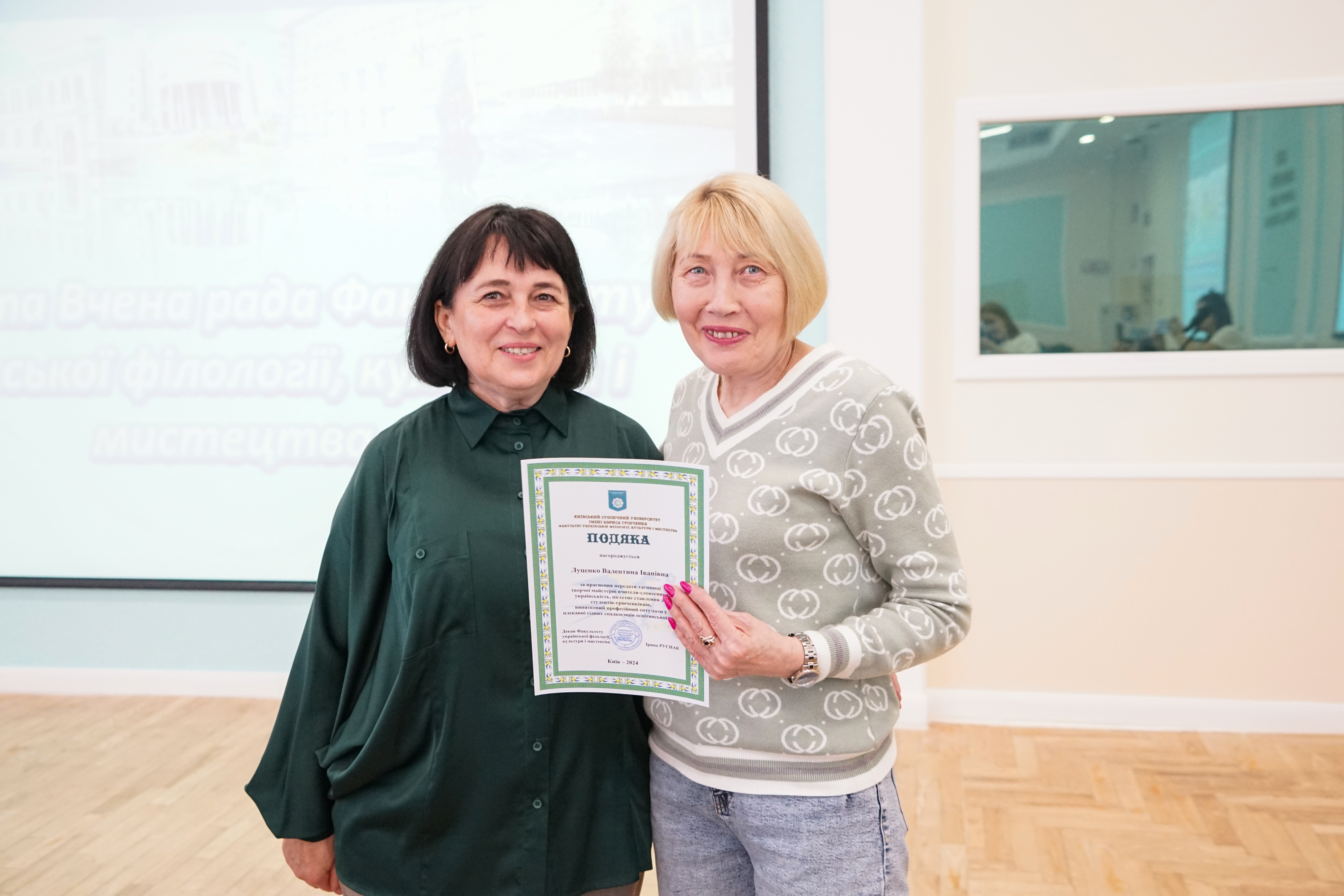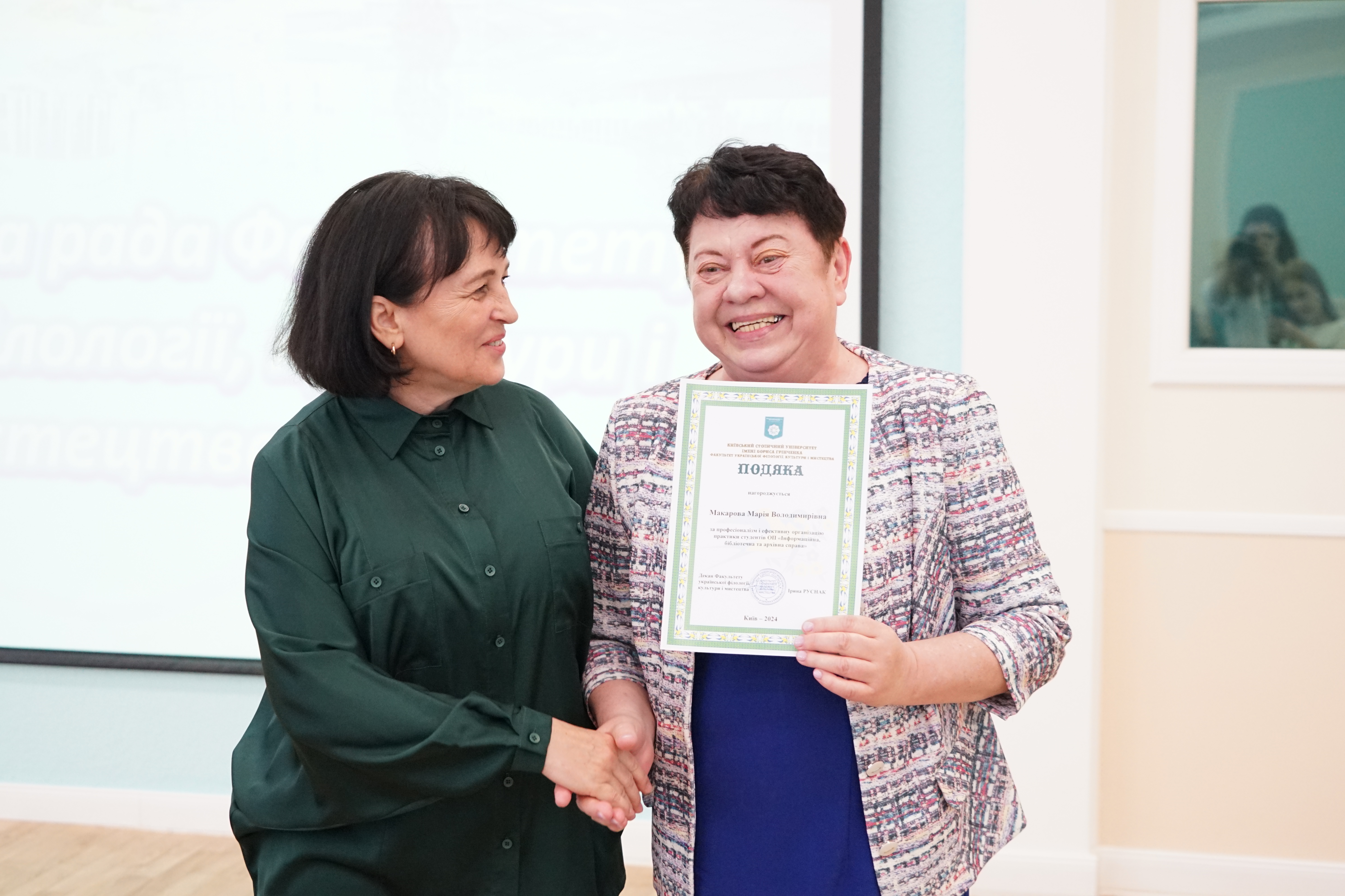 Вітальним словом розпочала зібрання голова Вченої ради, доктор філологічних наук, професор Ірина Руснак та вручила подяки партнерам Факультету за підтримку цінностей грінченківської родини, готовність реалізовувати креативні проєкти, тривалу співпрацю у підготовці здобувачів вищої освіти, забезпечення наукової атестації кадрів вищої кваліфікації, створення сприятливих умов для реалізації завдань практики та профорієнтації, атмосферу довіри, співтворчості, професійного оптимізму Світлані Каневській, в.о. директора наукової бібліотеки ім. Михайла Максимовича Київського національного університету імені Тараса Шевченка; Ользі Романюк, директору Публічної бібліотеки імені Лесі Українки для дорослих міста Києва; Тамарі Кулієвій, ученому секретареві Національної наукової медичної бібліотеки України; Володимиру Попику, директору Інституту біографічних досліджень Національної бібліотеки України імені В.І. Вернадського; Марині Штолько, завідувачу Науково-інформаційного відділу Інституту літератури ім. Т. Г. Шевченка НАН України; Олені Романенко, заступнику директора з науково-педагогічної роботи Навчально-наукового інституту філології Київського національного університету імені Тараса Шевченка; Лідії Кавун, професору кафедри української літератури Черкаського національного університету імені Богдана Хмельницького; Оксані Філатовій, завідувачу кафедри соціально-гуманітарних дисциплін Національного університету кораблебудування ім. адмірала Макарова; Володимирові Кузьменку, професорові кафедри східноєвропейських мов Національної академії Служби безпеки України; Михайлові Гнатюку, професорові кафедри теорії літератури та порівняльного літературознавства Львівського національного університету імені Івана Франка; Альбертові Новацкому, доцентові Інституту літературознавства Люблінського католицького університету Яна Павла II, м. Люблін, Республіка Польща; Олегові Сербіну, в. о. генерального директора Національної бібліотеки України імені Ярослава Мудрого; керівникам і вчителям спеціалізованої школи № 194 «Перспектива» Віталію Косачевичу, Наталії Білодід, Ользі Макаровій, Наталії Гунько, Ларисі Швець, Тетяні Рощенко, Євгенії Андрієнко; керівникам і вчителям школи І-ІІІ ступенів № 249 м. Києва Пилипові Пилипенку, Світлані Шиш, Олександрові Літашу, Валентині Луценко та Ользі Павленко; учителю іноземних мов і зарубіжної літератури школи І-ІІІ ступенів №245 м. Києва Ніці Явиць; керівникам і вчителям гімназії №283 ВГКДО «Дніпровська січ» м. Києва Володимирові Гнатюку, Ларисі Сівковській, Марії Швед, Аллі Усатій, Наталії Мухіній-Швець, Людмилі Литвинюк, Катерині Єршовій та Вікторії Дмитренко; керівникам і вчителям спеціалізованої школи № 252 імені Василя Симоненка м. Києва Олені Преподобній, Марії Кривицькій, Олені Ніколаєнко, Юлії Дрожжиній, Юрію Ільченкові, Людмилі Мартиненко, Світлані Борковській, Тетяні Яковчук та Ніні Лимар.