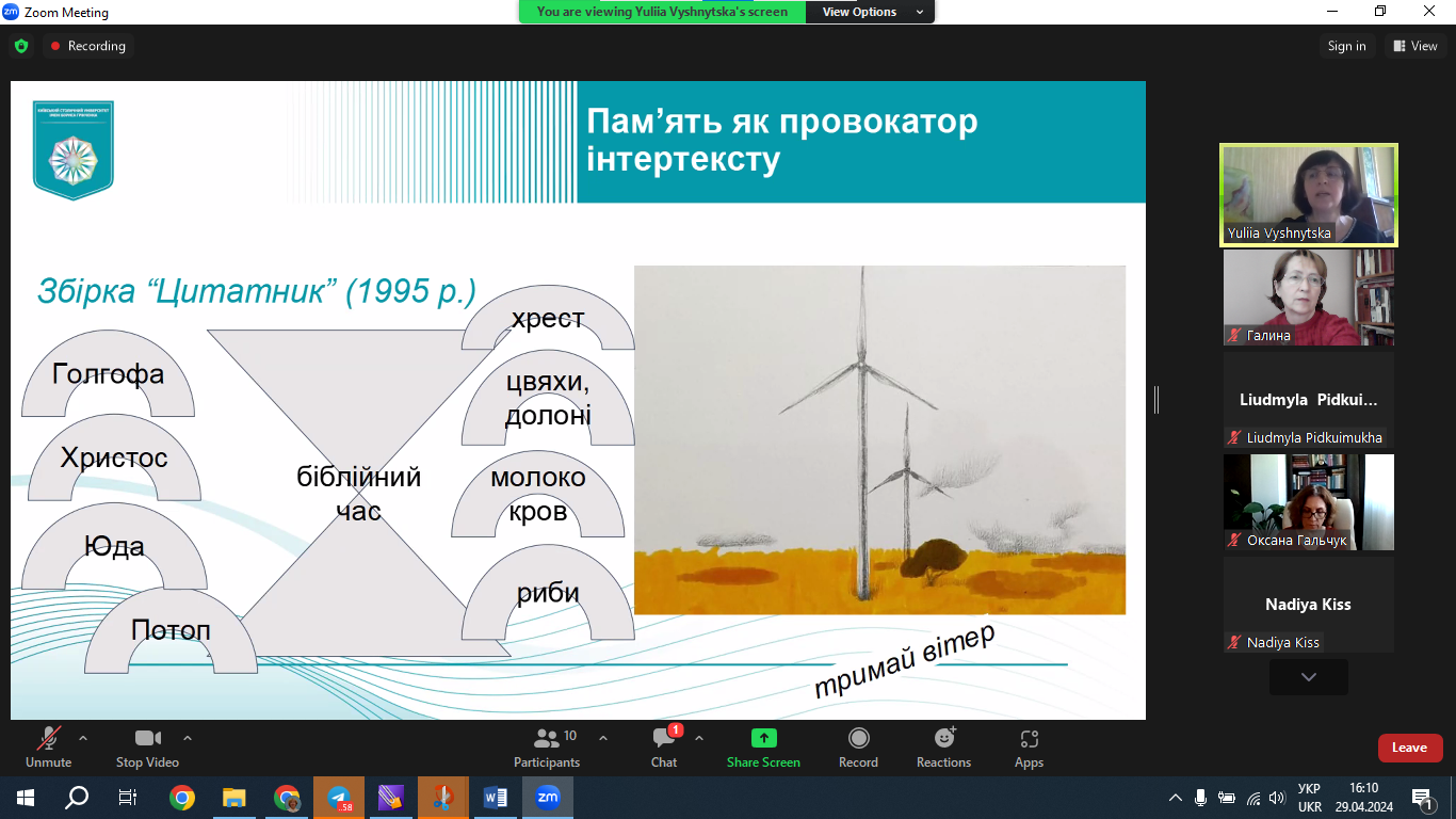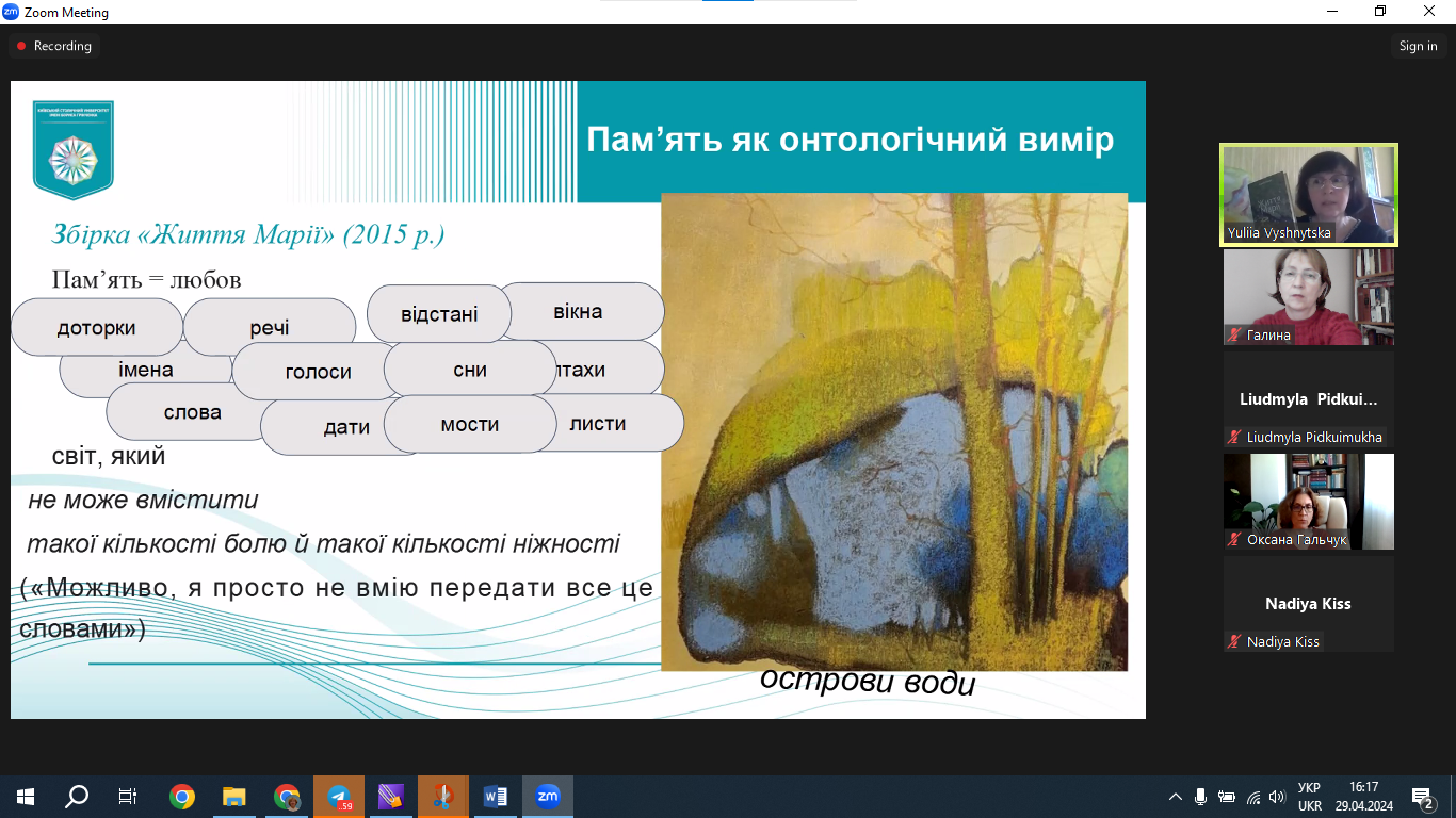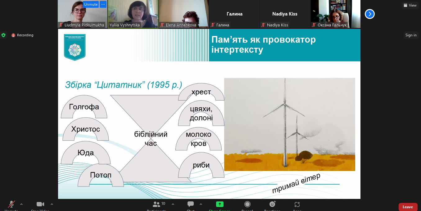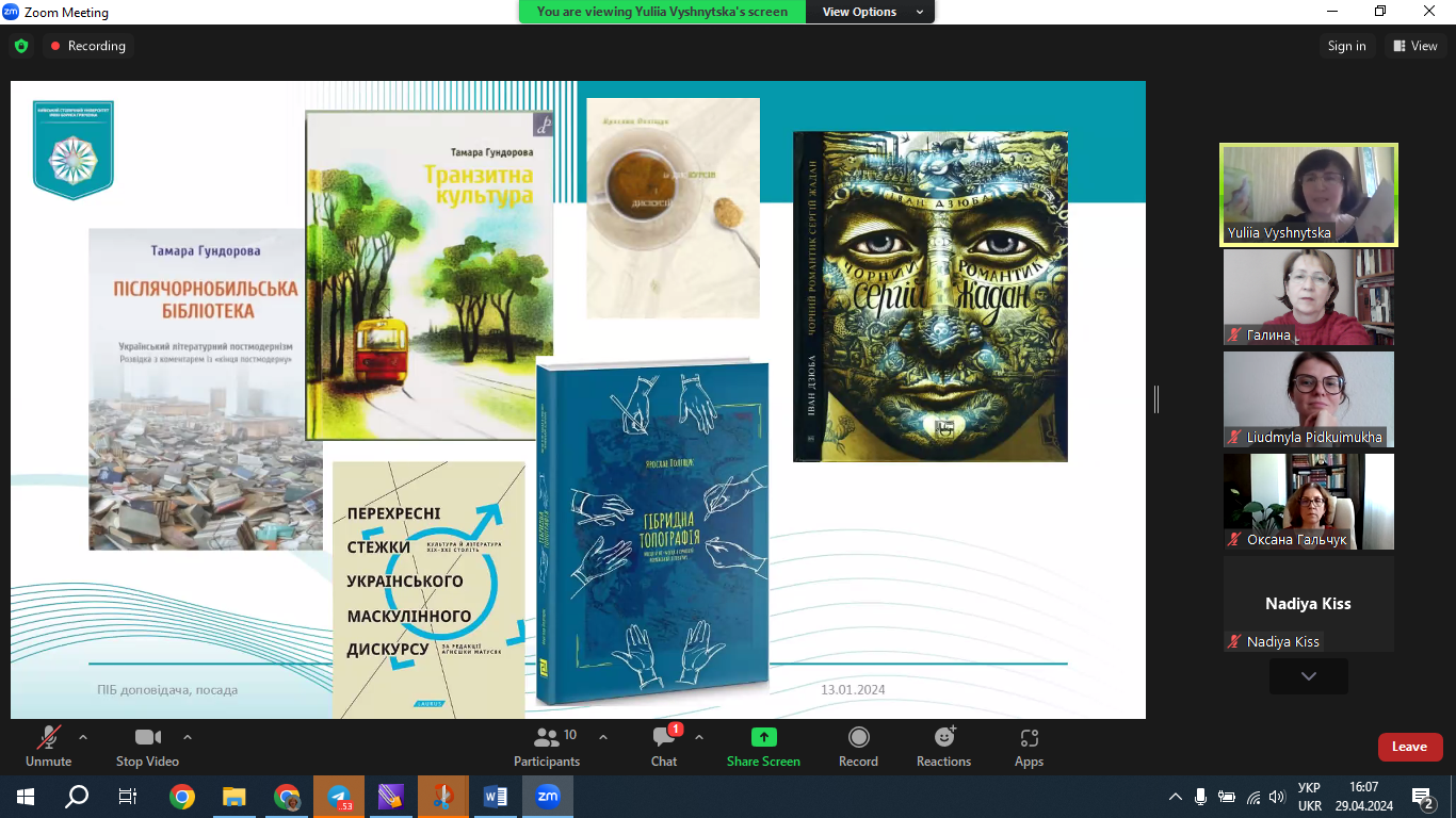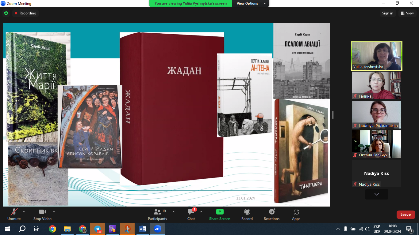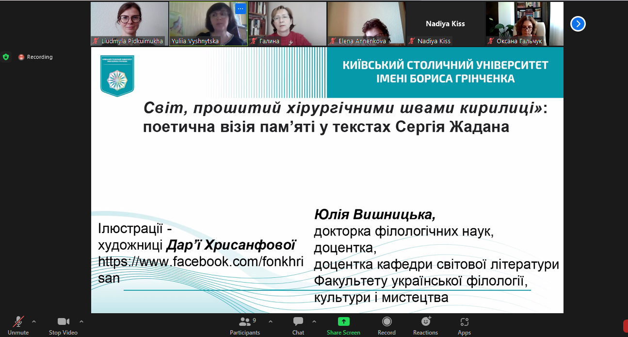 29 квітня 2024 р. доцент кафедри світової літератури, доктор філологічних наук Юлія Вишницька прочитала публічну лекцію «Світ, прошитий хірургічними швами кирилиці: поетична візія пам’яті в текстах Сергія Жадана». Захід організовано відповідно до плану співпраці кафедри світової літератури з міжнародною спільнотою науковців Vision Ukraїne. Netzwerk: Bildung, Sprache & Migration, місією якої є ревізія знань про Україну в німецькому науковому, медіальному й суспільному дискурсах. Лекція викликала жваву півторагодинну дискусію. До обговорення тез, а також спровокованої проблематики долучилися учасники міжнародного наукового об'єднання "Візія України" й колеги з різних українських університетів, зокрема професор Олена Анненкова (Український державний університет імені Михайла Драгоманова), професор Наталія Торкут (Запорізький національний університет) та ін. Модерувала захід Надія Кісс, співзасновник Interdisziplinär