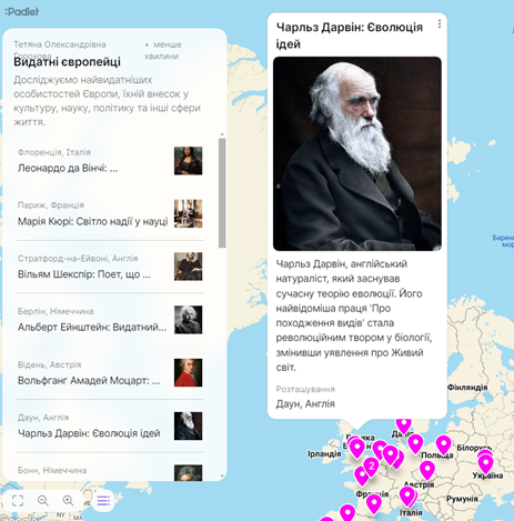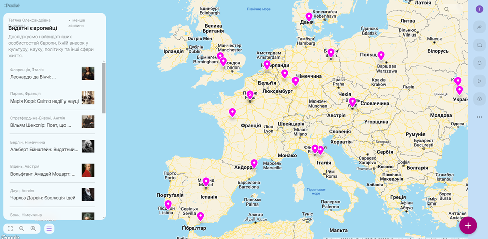 Відзначаючи День Європи, студенти і викладачі Факультету української філології, культури і мистецтва Київського столичного університету імені Бориса Грінченка створили інтерактивну мапу "Видатні європейці" (модератори - викладачі кафедри української мови Т.Горохова, Н.Лахно, М.Бойко). Європа подарувала світові велику кількість талановитих людей. З-поміж них - видатні вчені, винахідники, політики, громадські діячі, письменники, музиканти, художники, спортсмени, архітектори. Саме вони творили історію і зрештою змінили світ.