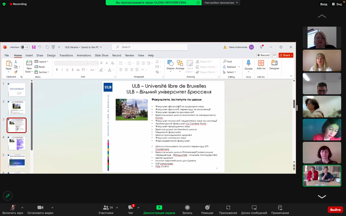 Оксана Козлова, викладач Департаменту перекладів Факультету літератури, перекладу та комунікації ULB, представила основні проєкти, що реалізує або підтримує університет у співпраці з іншими європейськими організаціями, зокрема Європейською мережею солідарності з Україною, Інститутом європейських досліджень та ін. (виставкова діяльність, започаткування кінолекторію «Час України – подорож українським кіно» з перегляду українських фільмів (за підтримки Довженко-центру у Києві та фінансування Культурної комісії ULB), відкриття вечірніх курсів вивчення української мови тощо).