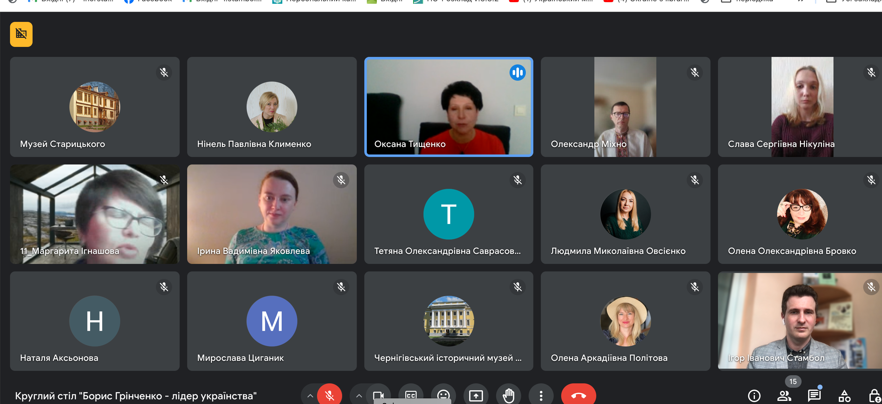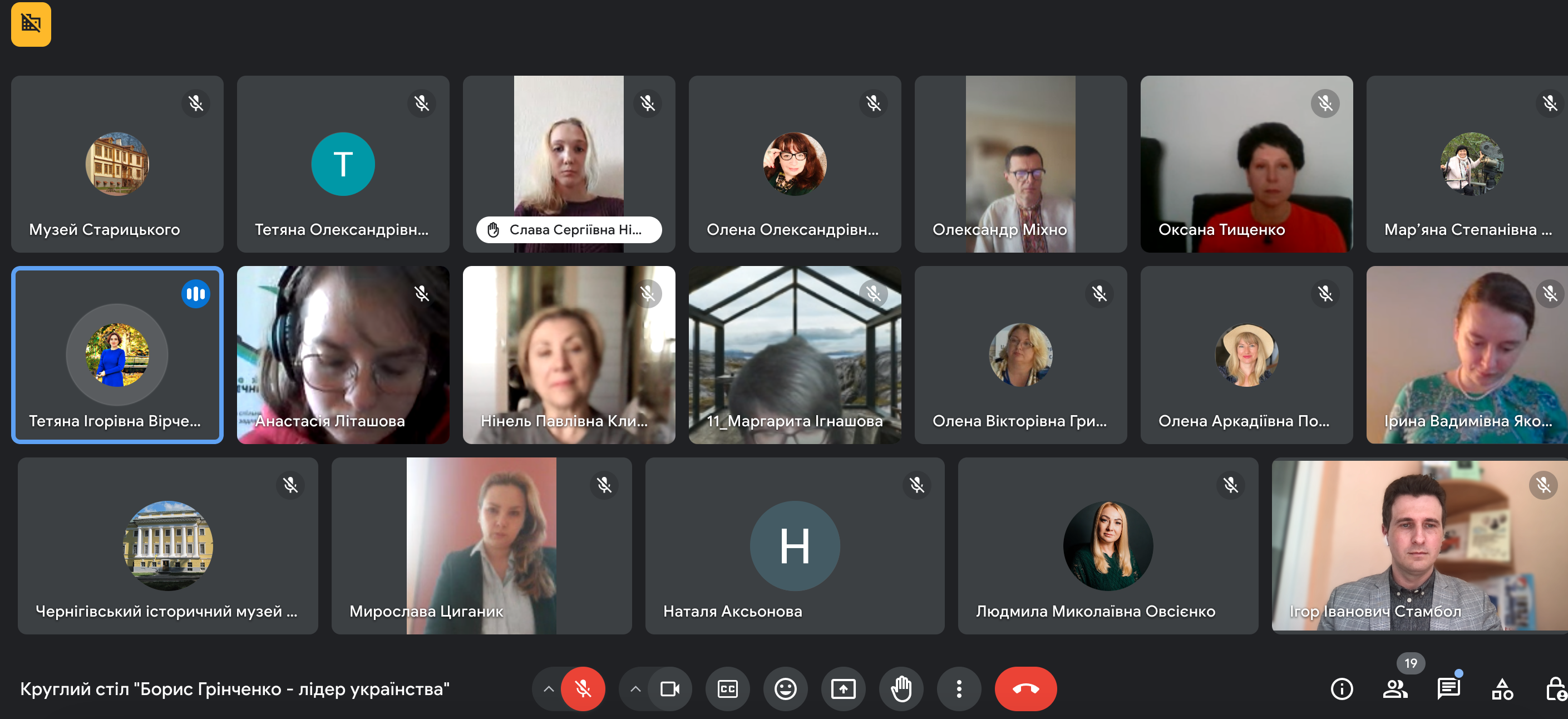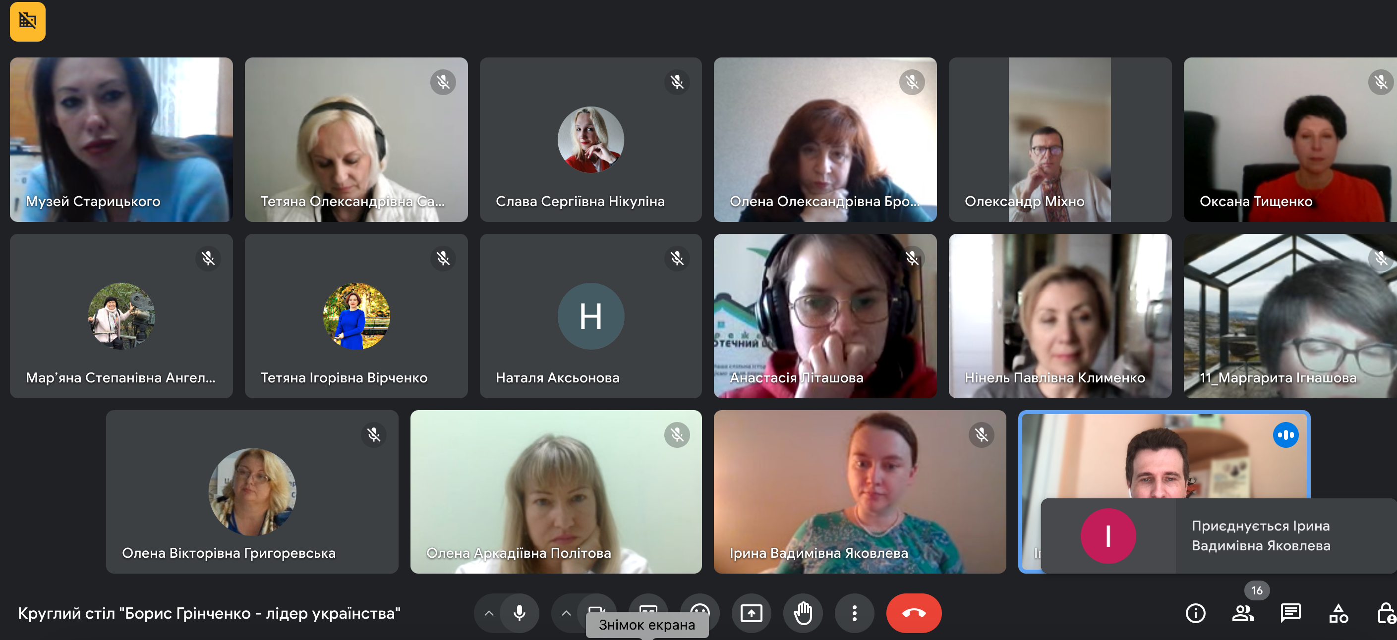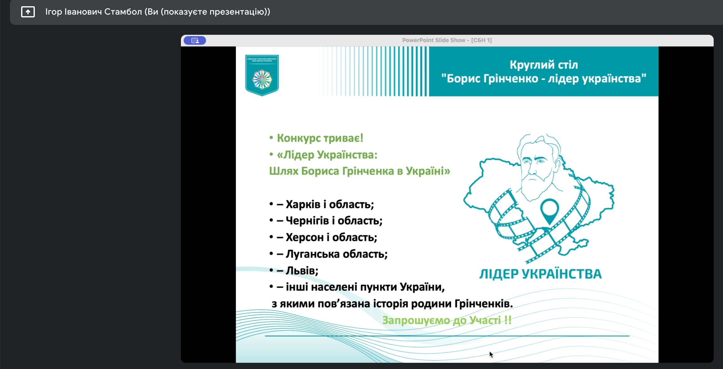 Інформацією про значення постаті й діяльності Бориса Грінченка в різних містах України поділилися учасники круглого столу, які представляють наукові та інформаційні установи Києва, Харкова, Львова, Чернігова, Херсону та Луганська (тимчасово переміщена). Колеги висловили слушні пропозиції, зауваження й погляди щодо організації і проведення Конкурсу (Олександр Міхно, доктор педагогічних наук, директор Педагогічного музею України; Ольга Гураль, кандидат історичних наук, директор Музею видатних діячів української культури; Анастасія Літашова, заступник директора Луганської обласної універсальної наукової бібліотеки; Оксана Тищенко, кандидат філологічних наук, доцент, старший науковий співробітник відділу лексикології, лексикографії та структурно-математичної лінгвістики Інституту української мови НАН України; Мирослава Циганик, кандидат філологічних наук, в.о. декана Факультету культури і мистецтв Львівського національного університету імені Івана Франка; Олена Бджола, бібліотекар інформаційного центру Херсонської обласної універсальної наукової бібліотеки імені Олеся Гончара; Наталя Аксьонова, кандидат історичних наук, доцент кафедри туристичного бізнесу та країнознавства Факультету міжнародних економічних відносин та туристичного бізнесу Харківського національного університету імені Василя Назаровича Каразіна).