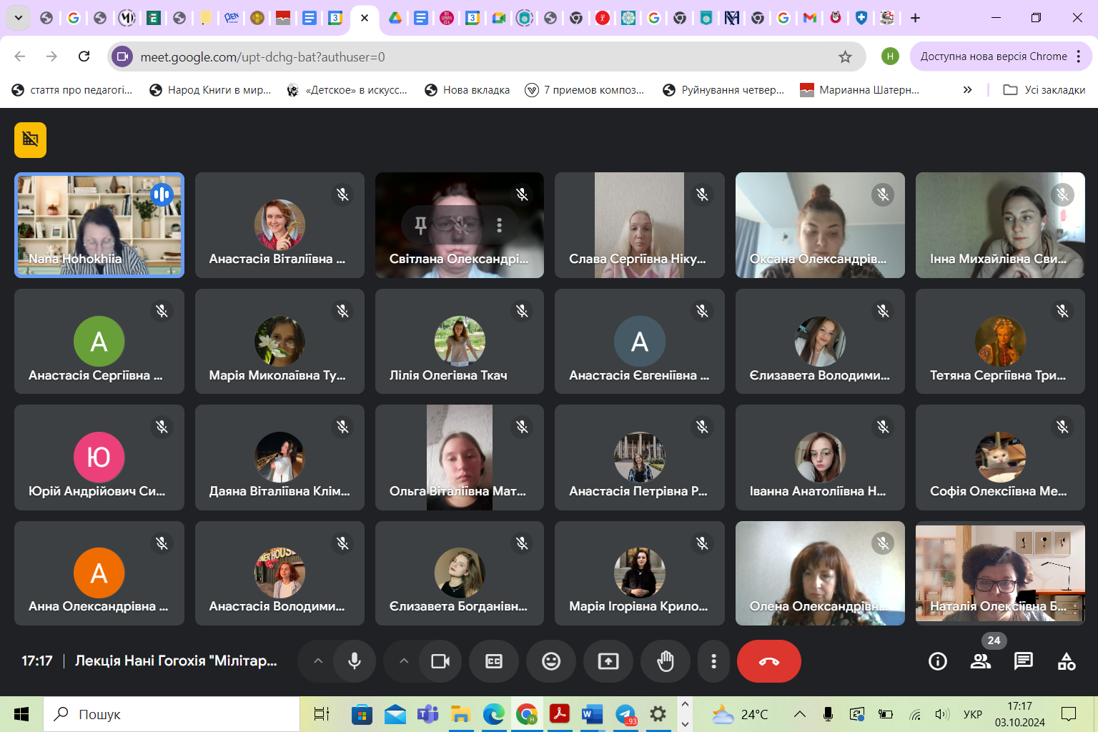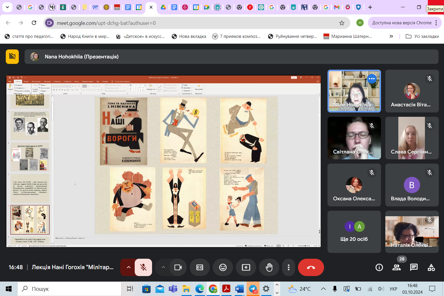 - гостьову лекцію «Мілітаризація на сторінках преси та ілюстрованих видань для дітей в Україні (1929-1941)» Нані Гогохія, кандидата історичних наук, доцента Луганського національного університету імені Тараса Шевченка (м. Полтава) (модератори – Євтушенко С.О., кандидат філологічних наук, доцент кафедри української літератури, компаративістики і грінченкознавства, Блохіна Н.О., старший викладач кафедри української літератури, компаративістики і грінченкознавства).