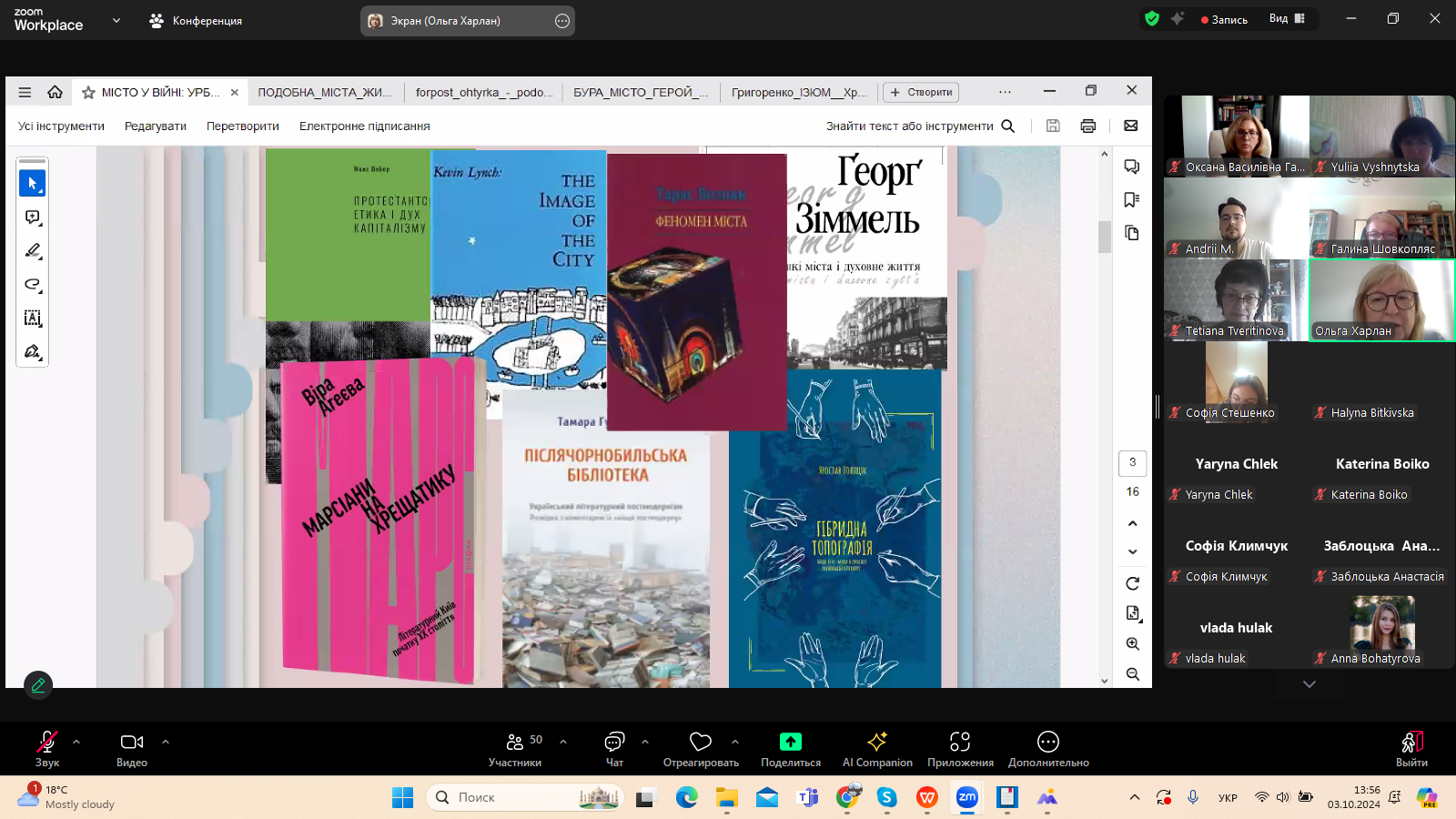 - гостьову лекцію «Місто у війні: урбаністичні координати сучасної української прози» Харлан О.Д., доктора філологічних наук, професора, завідувача кафедри української та зарубіжної літератури і порівняльного літературознавства Бердянського державного педагогічного університету (модератори – Бітківська Г. В., доктор філологічних наук, доцент, завідувач кафедри світової літератури, Гальчук О. В., доктор філологічних наук, доцент, професор кафедри світової літератури);