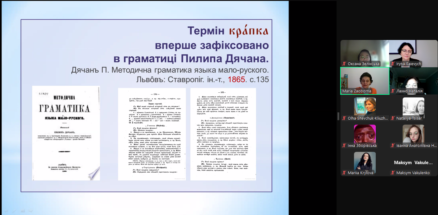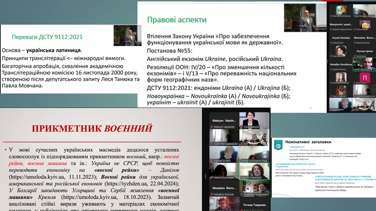 Доповідачі звернулись і до питань теоретичного і прикладного мовознавства. Непрості концептуальні співвідношення значення і смислу мовних одиниць розкрив у своїй доповіді Флорій Бацевич, завідувач кафедри загального мовознавства Львівського національного університету імені Івана Франка. На прикладних лінгвістичних аспектах, зокрема на передумовах і перевагах створення стандарту української латиниці, акцентував свою дослідницьку увагу Максим Вакуленко, науковий співробітник лабораторії мовних технологій факультету інформатики Дармштадтського університету прикладних наук «Hochschule Darmstadt». Аспекти неологізації мови медіа, мови художньої літератури та інших виявів мовного простору в часи війни представили у своїх виступах Марина Навальна, професор кафедри журналістики та мовної комунікації Національного університету біоресурсів і природокористування України, Тетяна Єщенко, завідувач кафедри українознавства Львівського національного медичного університету імені Данила Галицького, Михайло Вінтонів, завідувач кафедри української мови Київського столичного університету імені Бориса Грінченка.