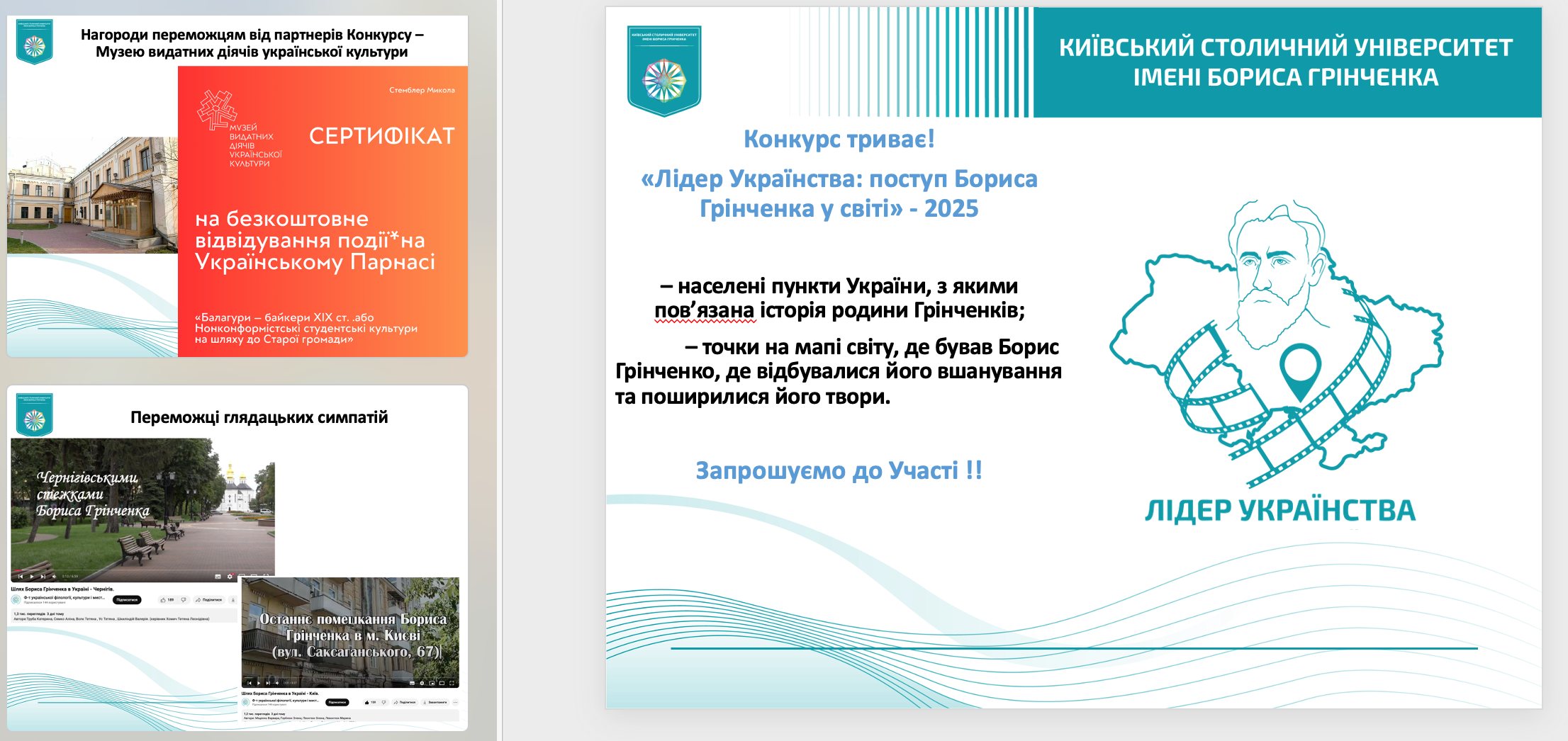 10 грудня 2024 року відбулося нагородження учасників конкурсу відео-робіт «Лідер українства: шлях Бориса Грінченка в Україні», організованого Факультетом української філології, культури і мистецтва Київського столичного університету імені Бориса Грінченка, метою якого є популяризація здобутків родини Грінченків та актуалізація пам’яті про неї у місцях її діяльності. Конкурс об’єднав науковців і здобувачів освіти з провідних культурних та науково-освітніх установ Києва, Львова, Чернігова та інших міст України.