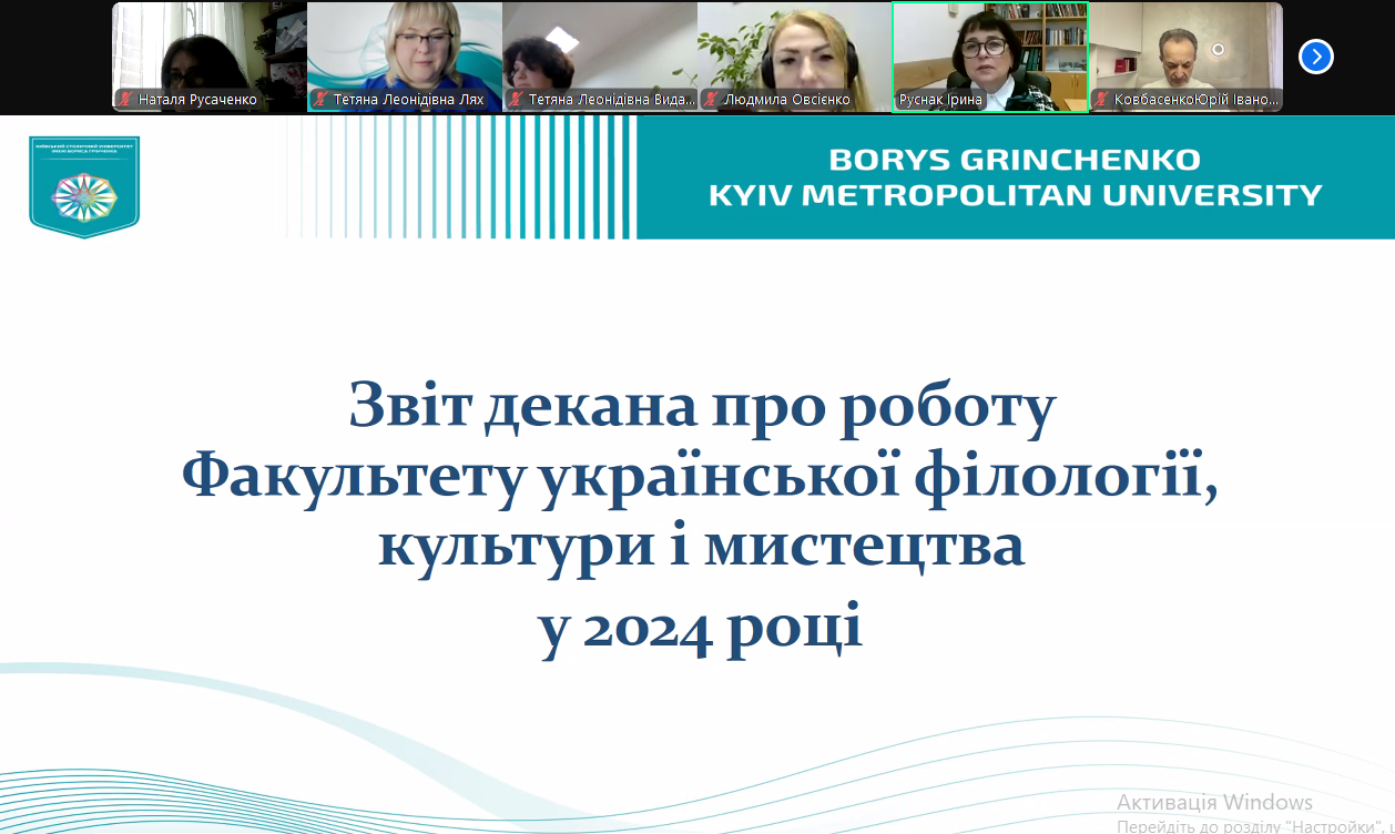 22 січня 2025 року відбулися Збори трудового колективу Факультету української філології, культури і мистецтва у форматі ZOOM-конференції. Участь у роботі зборів узяла 61 особа з числа штатних працівників і студентів, що становить 92,4% від усіх делегатів. Від адміністрації Університету збори відвідала проректор з науково-педагогічної та соціально-гуманітарної роботи Київського столичного університету імені Бориса Грінченка Тетяна Леонідівна Лях.