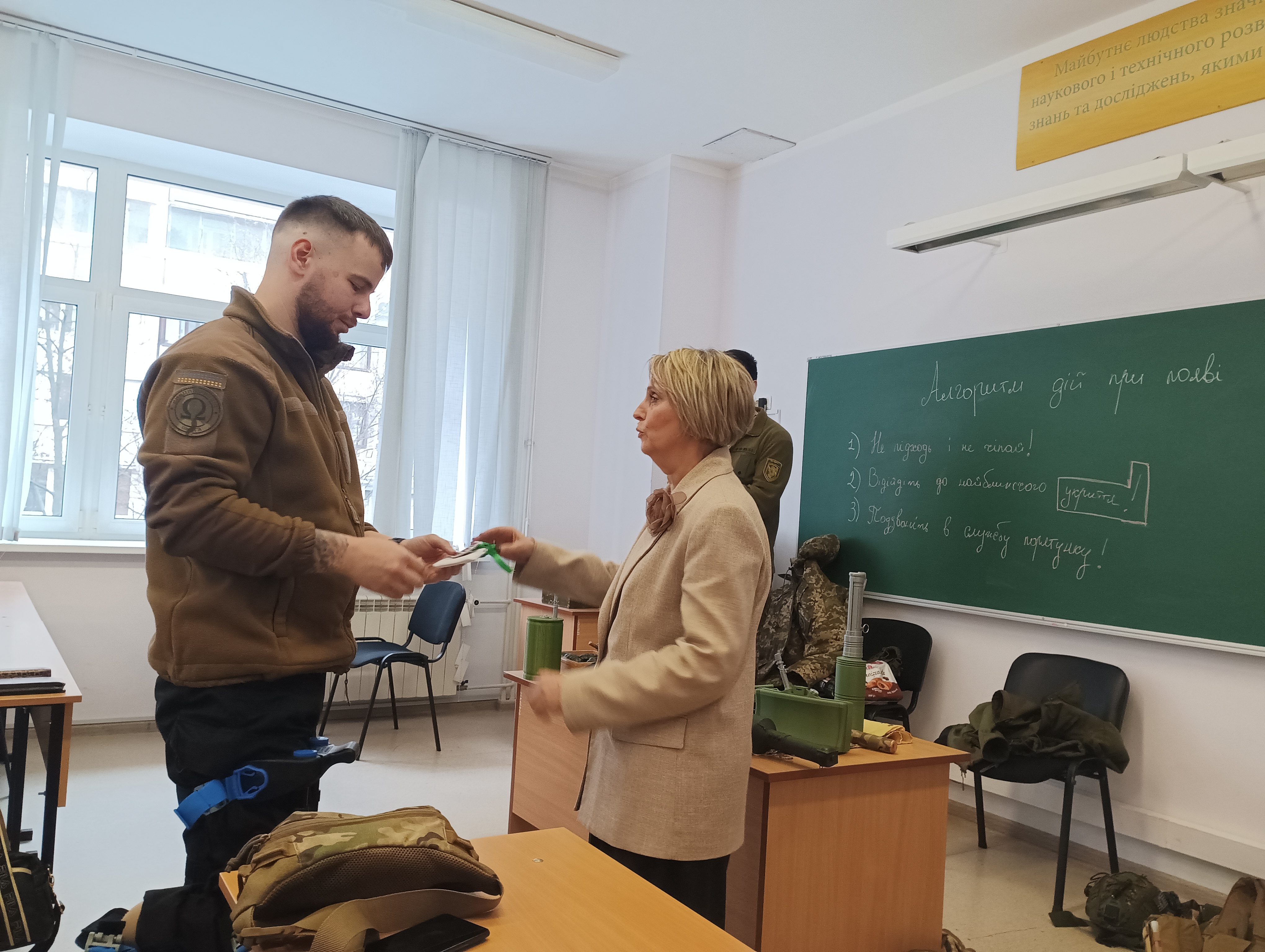 До заходу долучився випускник Університет Грінченка, учасник бойових дій Сергій Назаренко, який поділився досвідом участі в бойових діях, розповів про реальні ситуації, пов’язані з мінною небезпекою, з якими довелося зіткнутися на фронті, наголосив на важливості дотримання правил безпеки та обачності під час виявлення підозрілих предметів.
