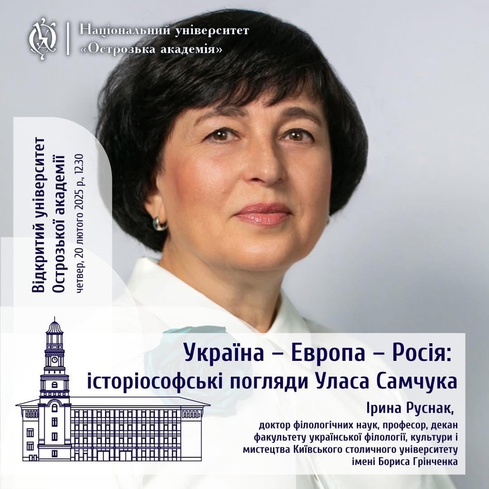 20 лютого 2025 року у Відкритому університеті Острозької Академії відбулася гостьова лекція «Україна – Европа – Росія: історіософські погляди Уласа Самчука» декана Факультету української філології, культури і мистецтва Київського столичного університету імені Бориса Грінченка, доктора філологічних наук, професора Ірини РУСНАК.