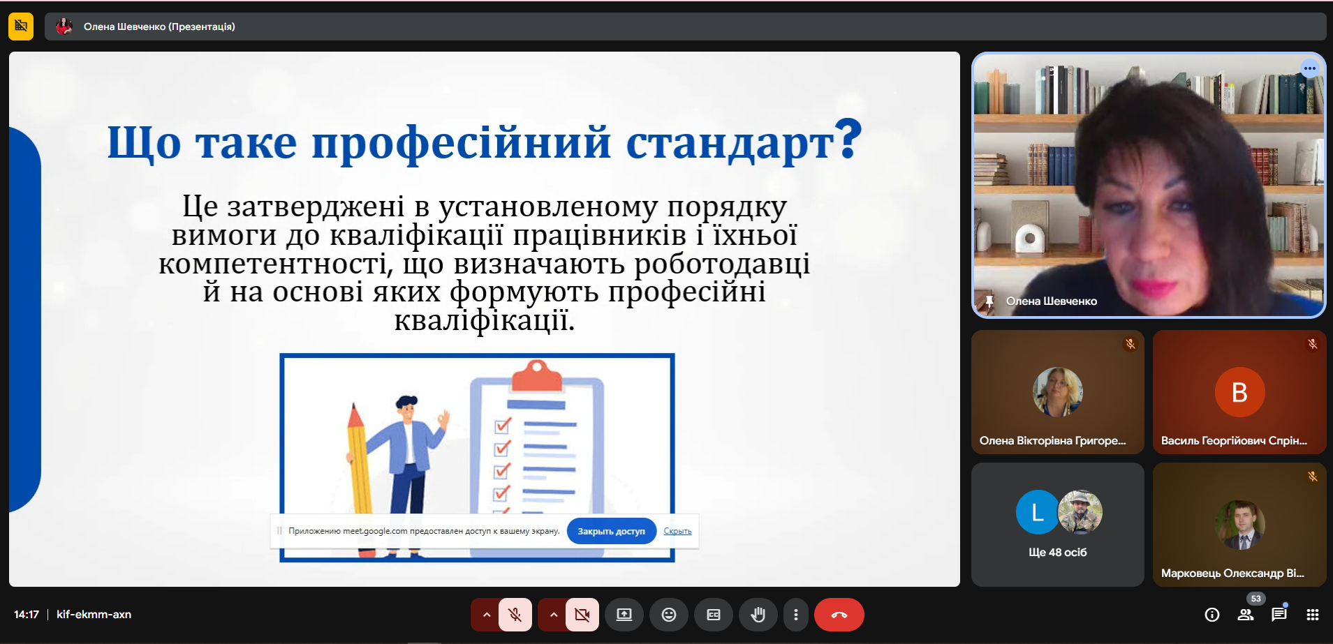 Ярослава Хіміч, кандидат історичних наук, доцент, доцент кафедри артменеджменту та інформаційних технологій Національної академії керівних кадрів культури і мистецтв, голова Секції з бібліотечно-інформаційної освіти ВГО Української бібліотечної асоціації представила присутнім практичні кейси з питань врахування вимог професійних стандартів у змісті освітніх компонентів освітньо-професійних програм.
