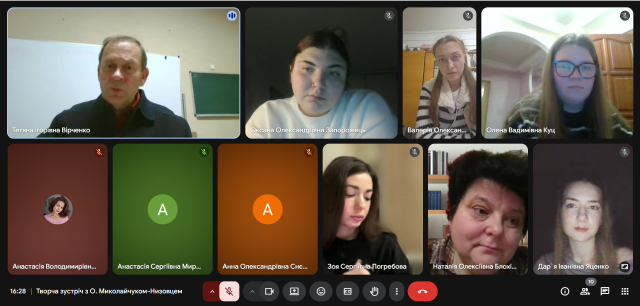 26 листопада на запрошення кафедри української літератури, компаративістики і грінченкознавства для студентів ОП «Українська мова і література» першого (бакалаврського) рівня вищої освіти і ОП «Біографістика і текстологія» другого (магістерського) рівня вищої освіти відбулася творча зустріч із драматургом, журналістом, кіносценаристом, науковим співробітником Національного центру театрального мистецтва ім. Леся Курбаса Олегом Миколайчуком-Низовцем (модератор зустрічі – старший викладач Наталія Блохіна, координатор події – професор Тетяна Вірченко). У фокусі розмови була п’єса «Зніміть з небес офіціанта, або Навіщо нам позаторішній сніг» у двох редакціях, що дало змогу простежити еволюцію авторського задуму, жанрові модифікації («майже моновистава», «драма на одну дію з феєричними варіаціями»), символіку назви та особливості діалогізму й образної системи твору.