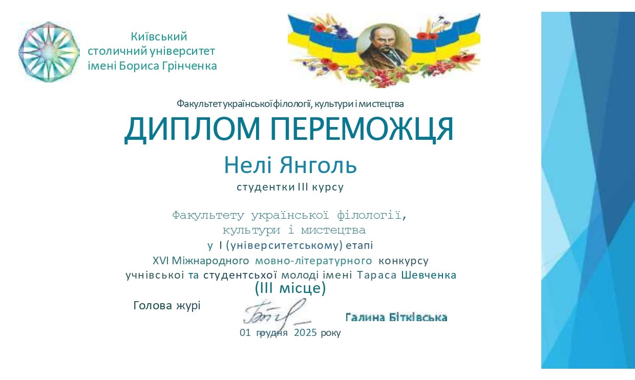 Янголь Неля Сергіївна, студентка 3 курсу бакалаврського рівня вищої освіти ОП «Українська мова та література» Факультету української філології, культури і мистецтва ‒ ІІІ місце.