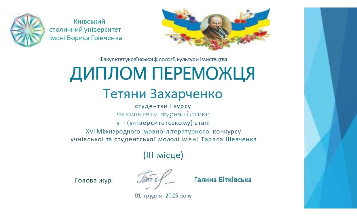 Захарченко Тетяна Вікторівна, студентка 1 курсу бакалаврського рівня вищої освіти ОП «Видавнича справа та редагування» Факультету журналістики ‒- ІІІ місце.
