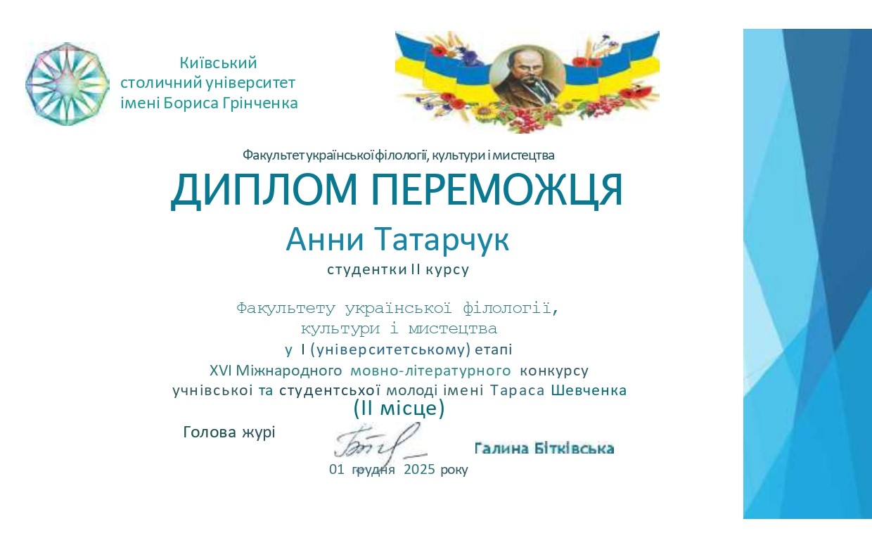 Татарчук Анна Василівна, студентка 2 курсу бакалаврського рівня вищої освіти ОП «Українська мова та література» Факультету української філології, культури і мистецтва ‒ ІІ місце;