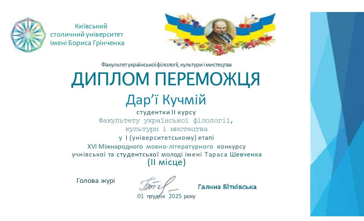 Кучмій Дарія Олегівна, студентка 2 курсу бакалаврського рівня вищої освіти ОП «Українська мова та література» Факультету української філології, культури і мистецтва ‒ ІІ місце;