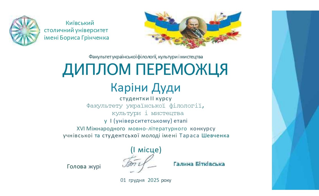 Дуда Каріна Миколаївна, студентка 2 курсу бакалаврського рівня вищої освіти ОП «Українська мова та література» Факультету української філології, культури і мистецтва ‒ І місце;
