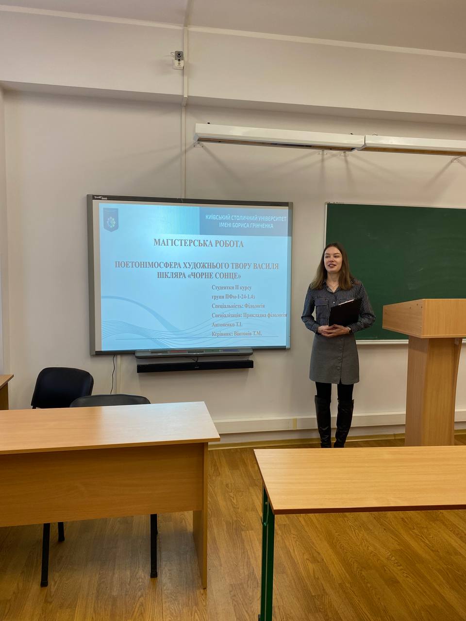 Відбувся захист 4 кваліфікаційних робіт (проєктів) здобувачів: Антоненко Тетяни («Поетонімосфера художнього твору Василя Шкляра “Чорне сонце”»), Закорка Вадима («Національно-мовна картина світу крізь призму лексики язичництва»), Кравченко Альони («Майстерня креативного письма. Практичний посібник»), Миронюк Поліни («Лірична проза Ольги Кобилянської й Уляни Кравченко: своєрідність моделювання художнього світу»). Магістерські роботи виконані на високому рівні, що й засвідчив захист, здобувачі продемонстрували високі знання і сформовані навички самостійної дослідницької роботи у доборі й аналізі матеріалу, розробці концепції наукового пошуку. Відзначимо, що роботи студентів були попередньо належним чином апробовані.