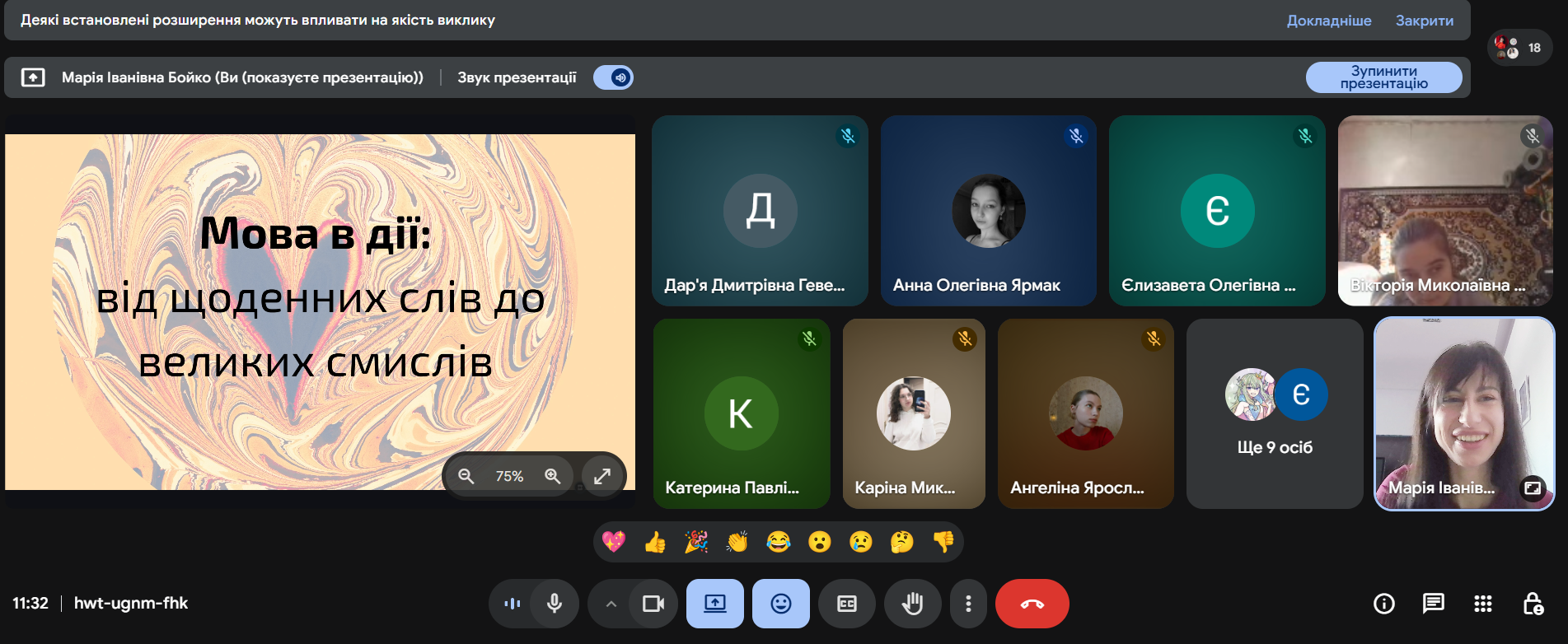 Доцент кафедри української мови Валентина Дроботенко провела майстерню «Лабораторія правописної точності: досліджуємо, перевіряємо, застосовуємо», під час якої студенти у форматі інтерактивної роботи аналізували впровадження норм правопису 2019 року в сучасному медіапросторі, досліджували дискусійні мовні випадки, розглядали орфоепічні та лексичні помилки й виконували практичні завдання, що дало змогу переконатися: культура точного слова є спільною цінністю як для філологів, так і для майбутніх математиків, адже точність формул і точність мовлення мають єдину інтелектуальну основу.