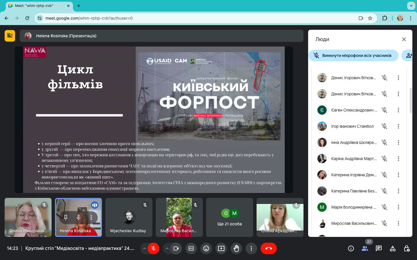 – дослідницька презентація Олени Росінської, доцента кафедри соціології Київського національного економічного університету, стипендіатки програми NAWA Polonista (Польща, Сілезький університет в Катовіце) «Оборона Київщини в українській та польській документалістиці»;