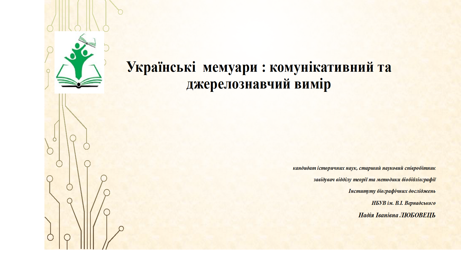 17 травня 2024 р. для здобувачів освітньо-наукової програми 035/029.00.02 «Біографістика і текстологія» гостьову лекцію «Українські мемуари: комунікативний та джерелознавчий вимір» провела завідувач відділу теорії та методики біобібліографії Інституту біографічних досліджень НБУВ, кандидат історичних наук, старший науковий співробітник Надія Любовець. Тематика лекції відповідає завданням опанування магістрами дисципліни «Джерелознавство» (викладач - професор кафедри інформаційних комунікацій, доктор наук із соціальних комунікацій Олена Григоревська).
