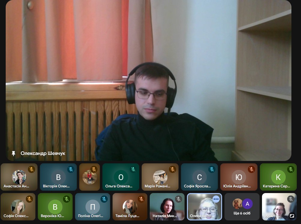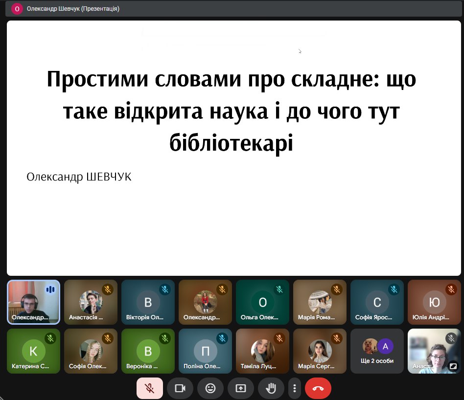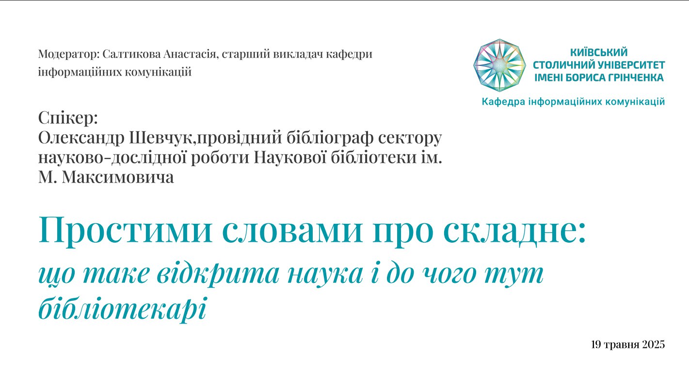 19 травня 2025 року відбулась онлайн-зустріч студентів та викладачів кафедри інформаційних комунікацій Факультету української філології, культури і мистецтва Університету Грінченка з випускником-магістром кафедри, провідним бібліографом сектору науково-дослідної роботи Наукової бібліотеки ім. М. Максимовича Олександром Шевчуком.