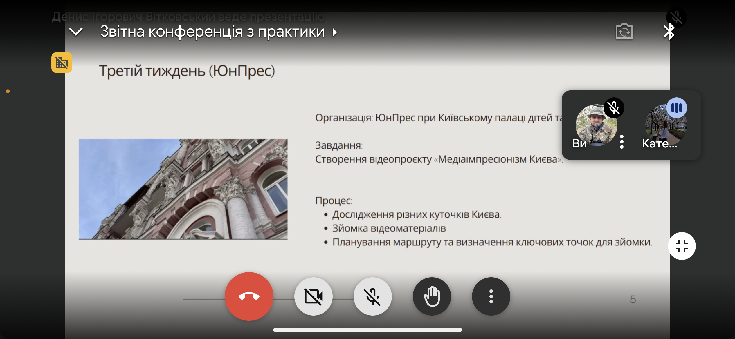 У період з 20 травня 2024 р. до 16 червня 2024 р. в студентів 3 курсу ОПП "Ведучий телевізійних програм" групи ВТПб-1-21-4.0д спеціальності 021 "Аудіовізуальне мистецтво та виробництво" відбулася виробнича (монтажно-операторська) практика на базі Українського кризового медіа-центру (далі УКМЦ) та Монтажно-операторської студії Інформаційно-творчого агентства «ЮН-ПРЕС» Київського Палацу дітей та юнацтва», керівником якої був старший викладач кафедри інформаційних комунікацій Денис Ігорьович Вітковський.
