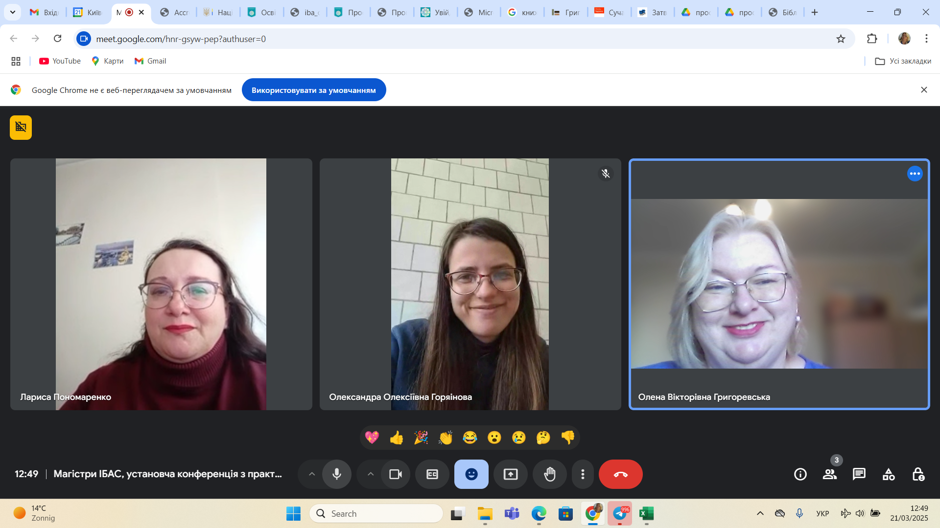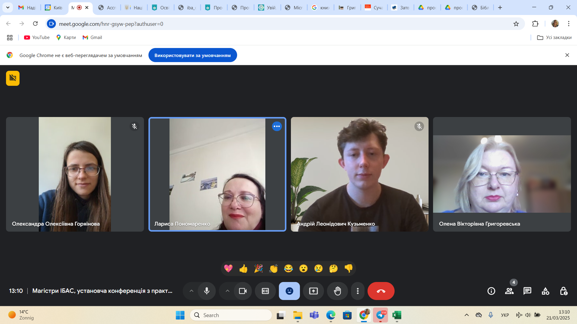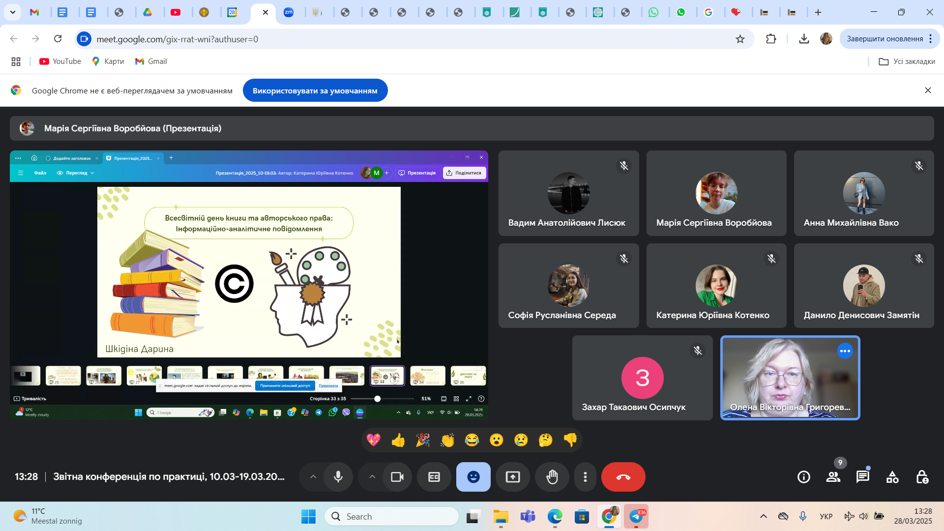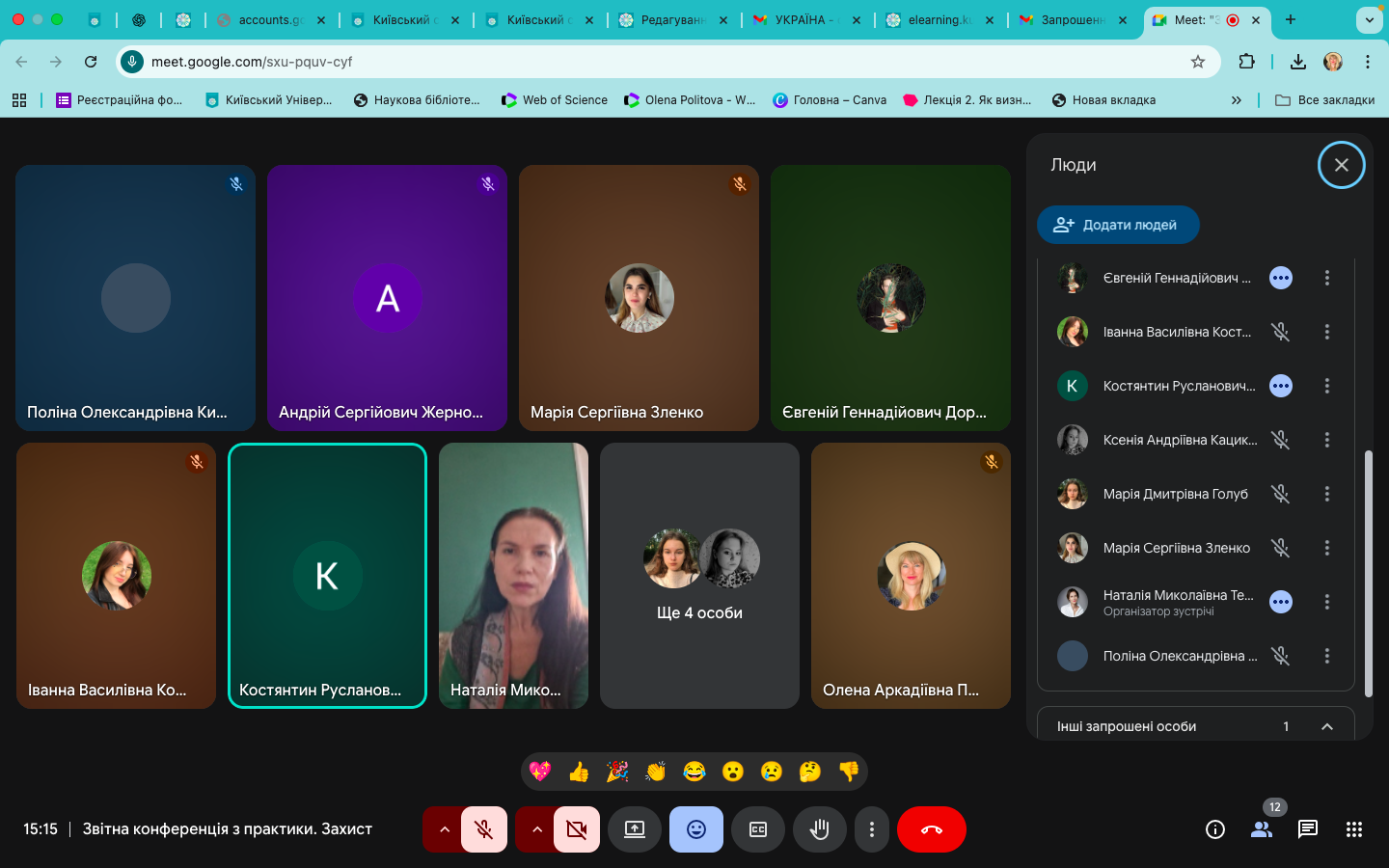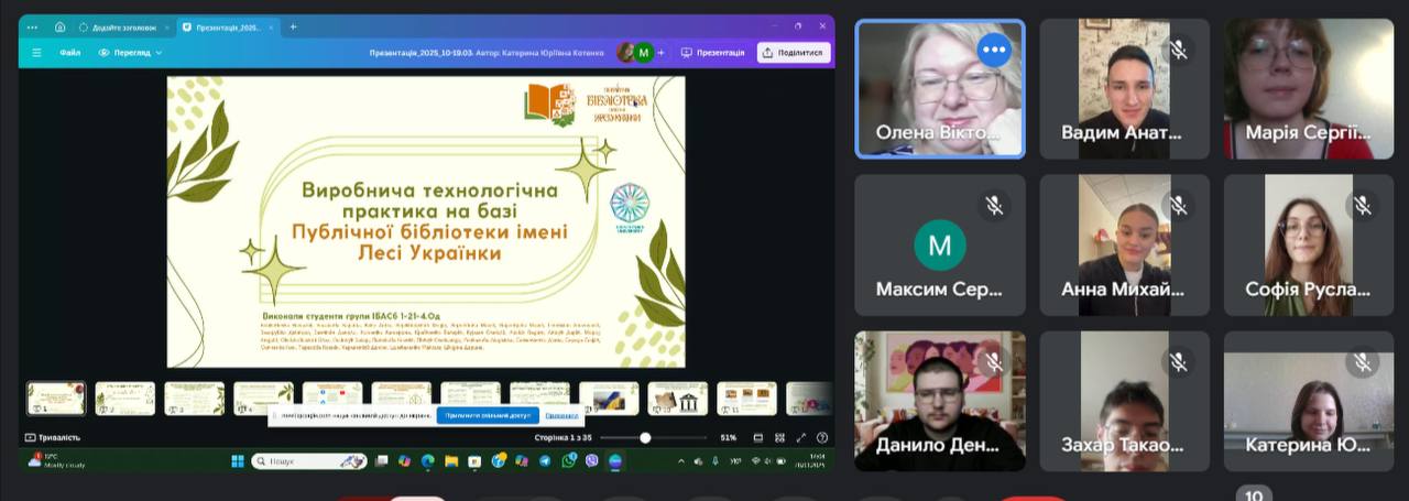 28 березня 2025 р. відбулося обговорення підсумків виробничої (технологічної) практики, яку з 10 по 19 березня 2025 р. проходили здобувачі 4 курсу першого (бакалаврського) рівня вищої освіти денної форми навчання спеціальності 029 Інформаційна, бібліотечна та архівна справа Факультету української філології, культури і мистецтва. Практика відбувалася з урахуванням дистанційного формату на базі Публічної бібліотеки імені Лесі Українки для дорослих м. Києва. Керівники практики: від Університету Грінченка – професор кафедри інформаційних комунікацій Григоревська О.В. і доцент кафедри інформаційних комунікацій Малюк Є.О., від бібліотеки – завідувачка науково-методичного відділу Іванова І.М..