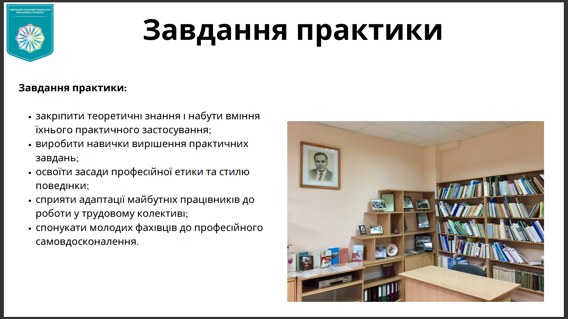 Упродовж практики здобувачі освіти будуть мати можливість отримати новий цінний досвід та практичні навички, що допоможуть у майбутньому. Заплановані завдання будуть стосуватися каталогізації документів та наповнення сайту бібліотеки.